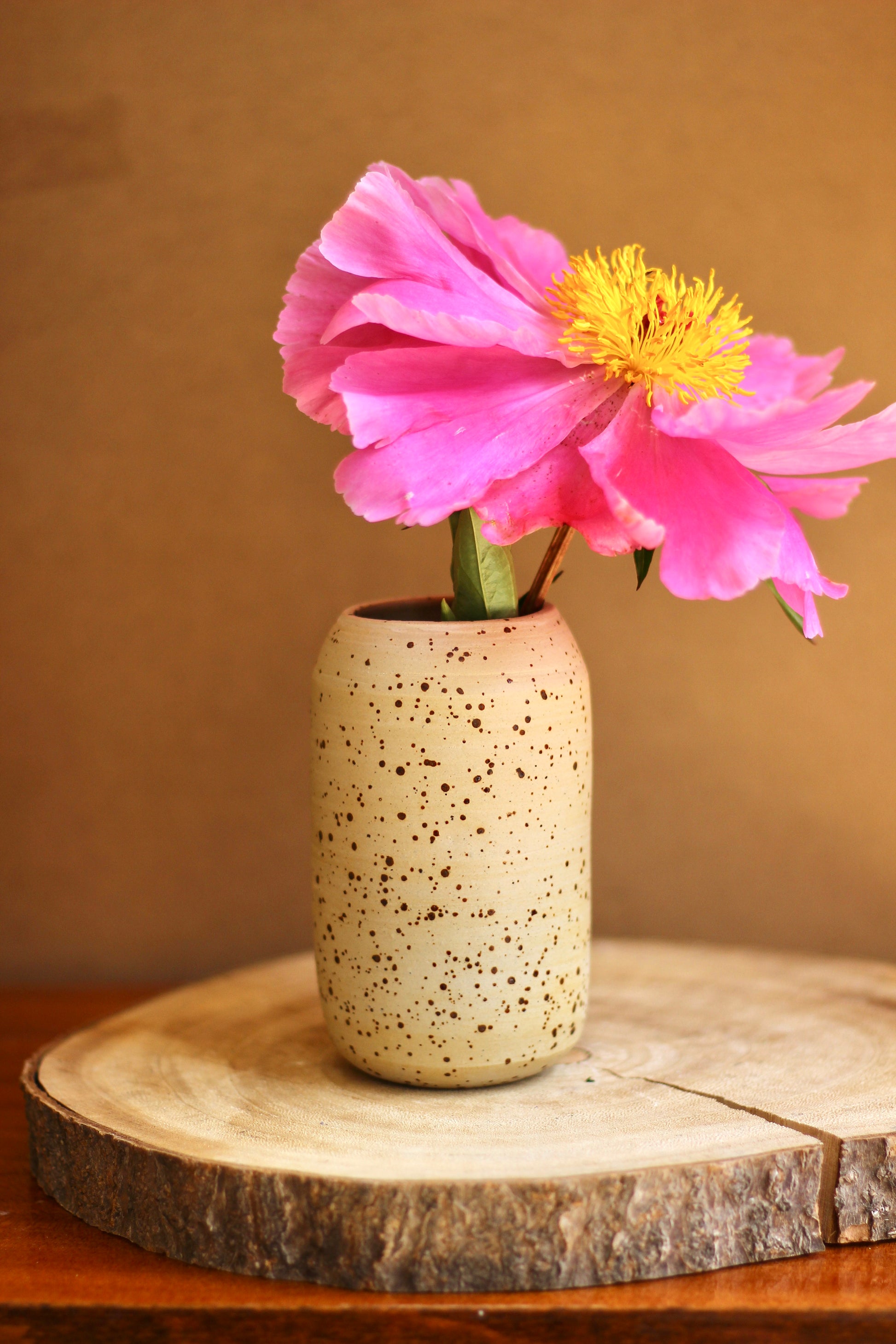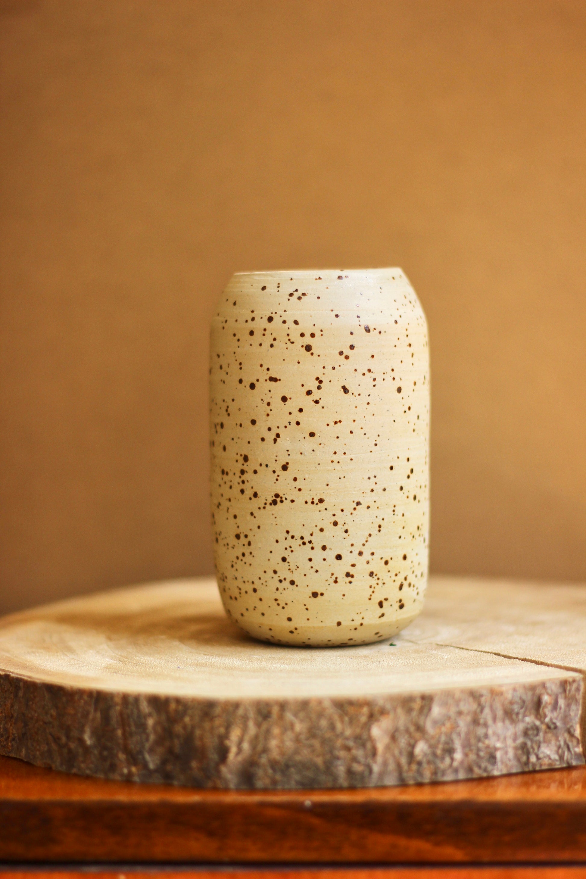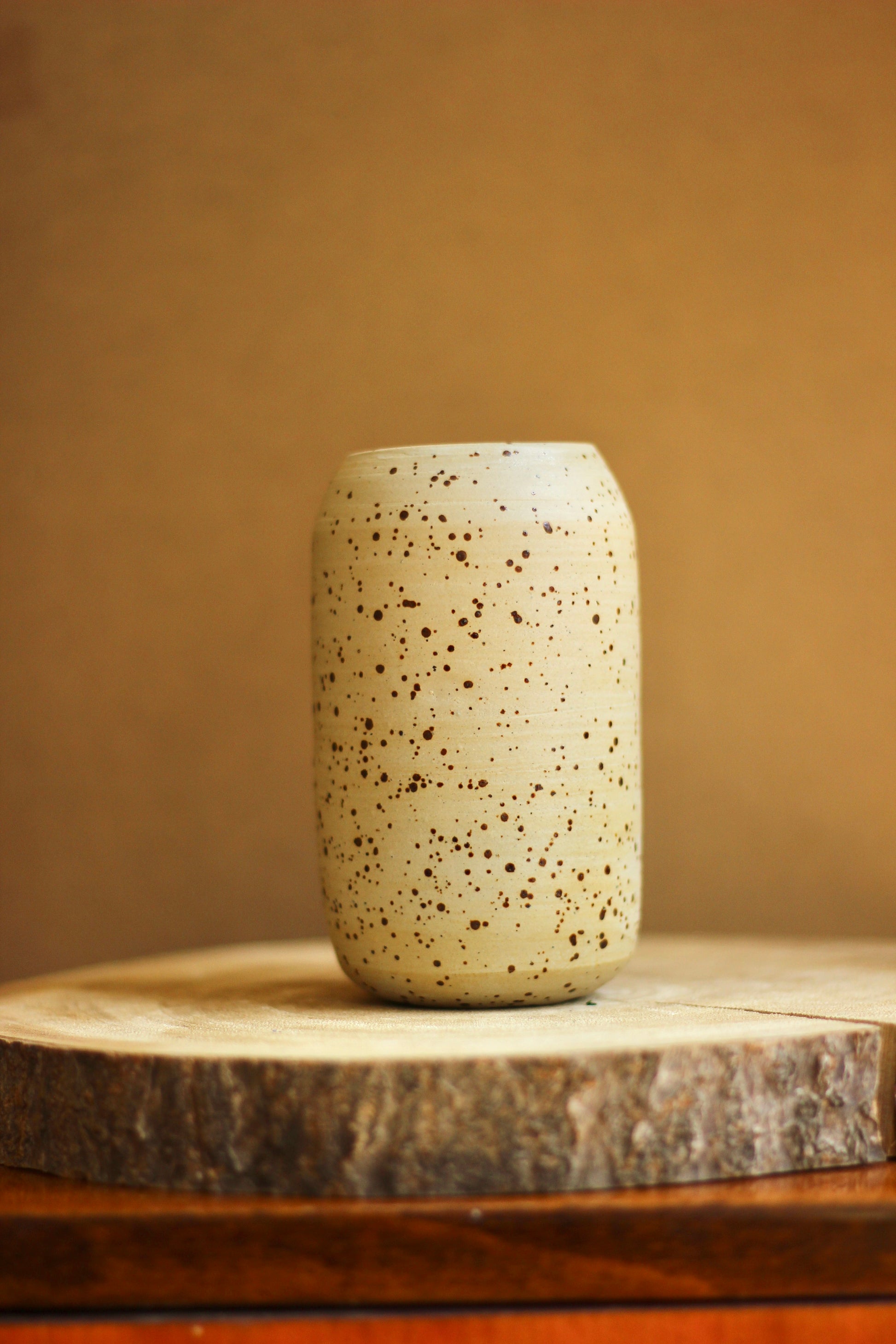El jarrón de cerámica está elaborado en gres, torneado a mano.