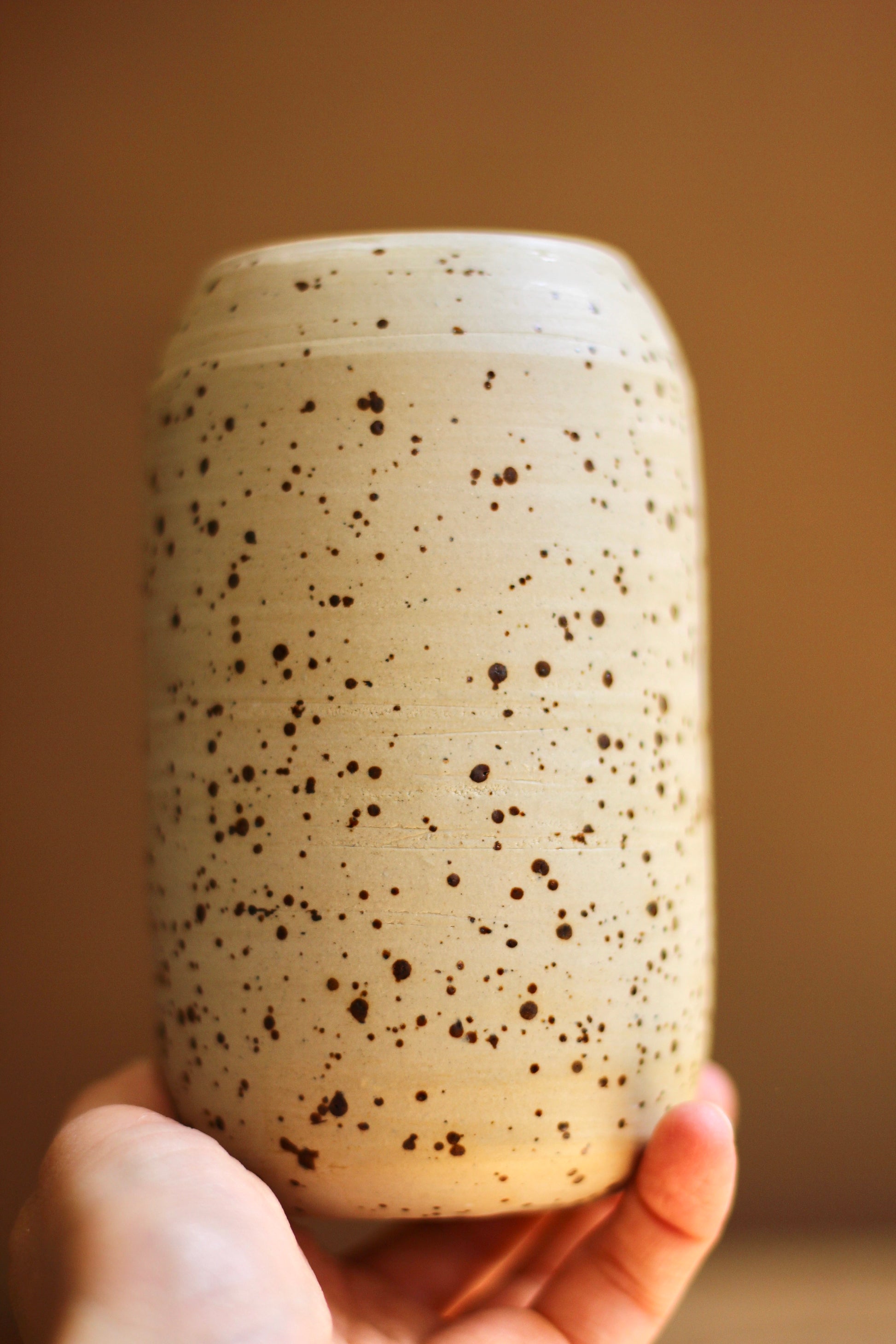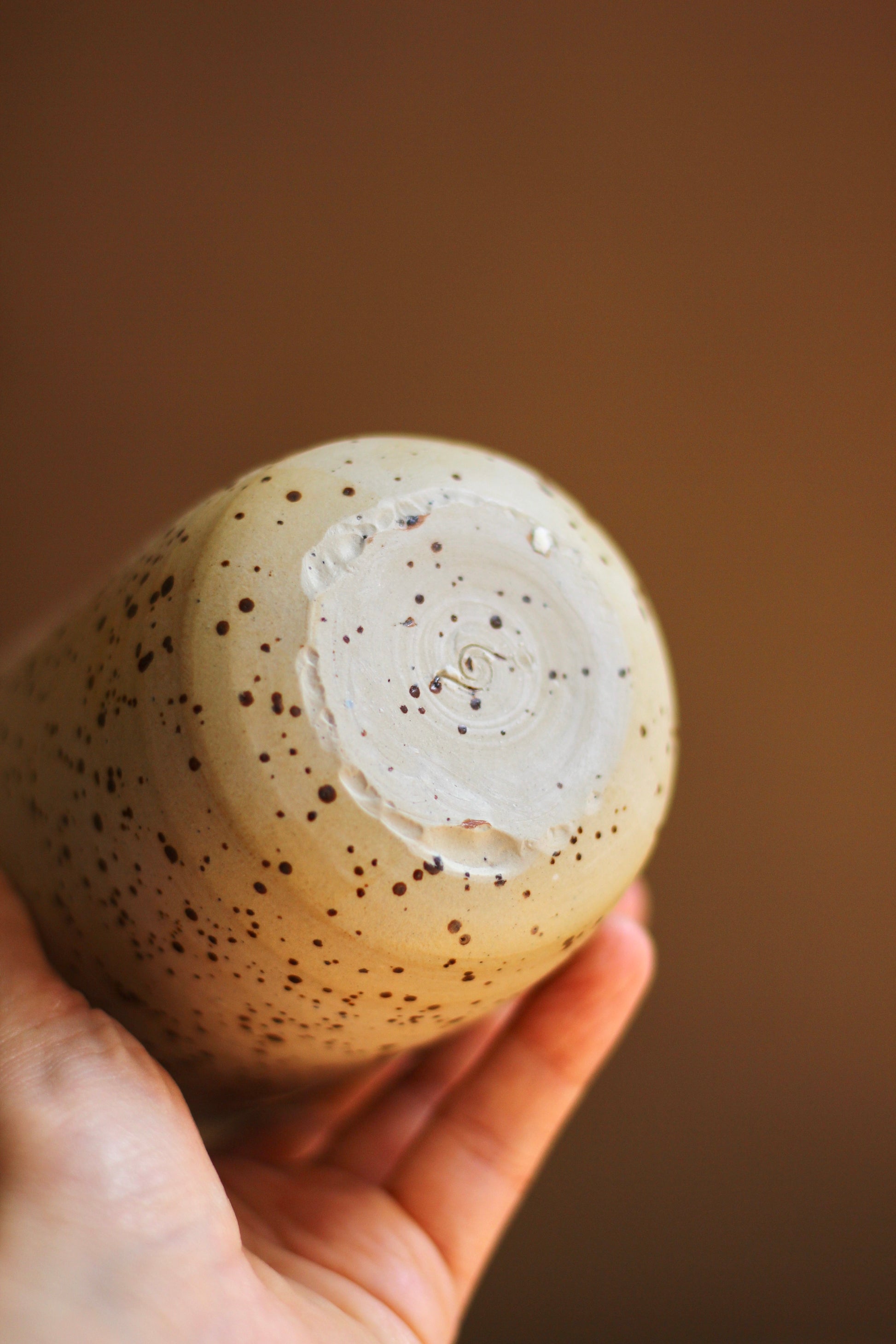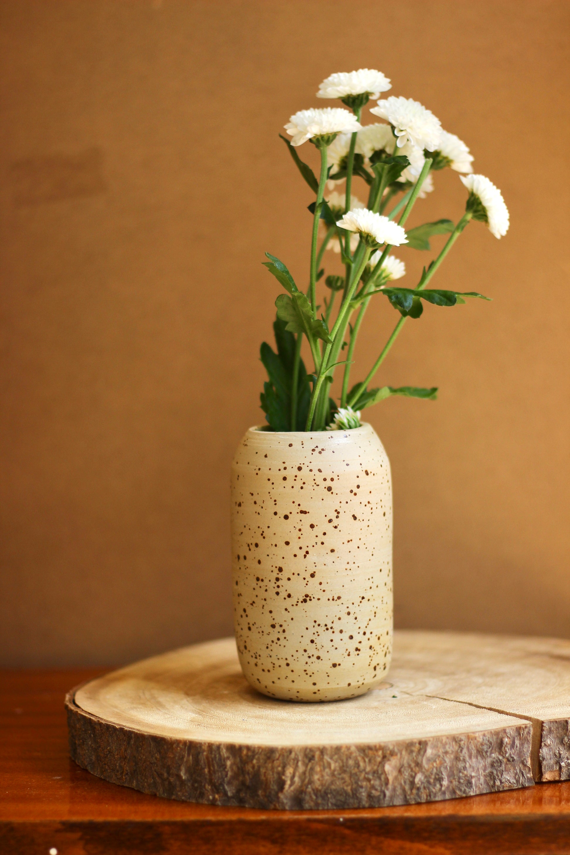 El jarrón de cerámica está elaborado en gres, torneado a mano.