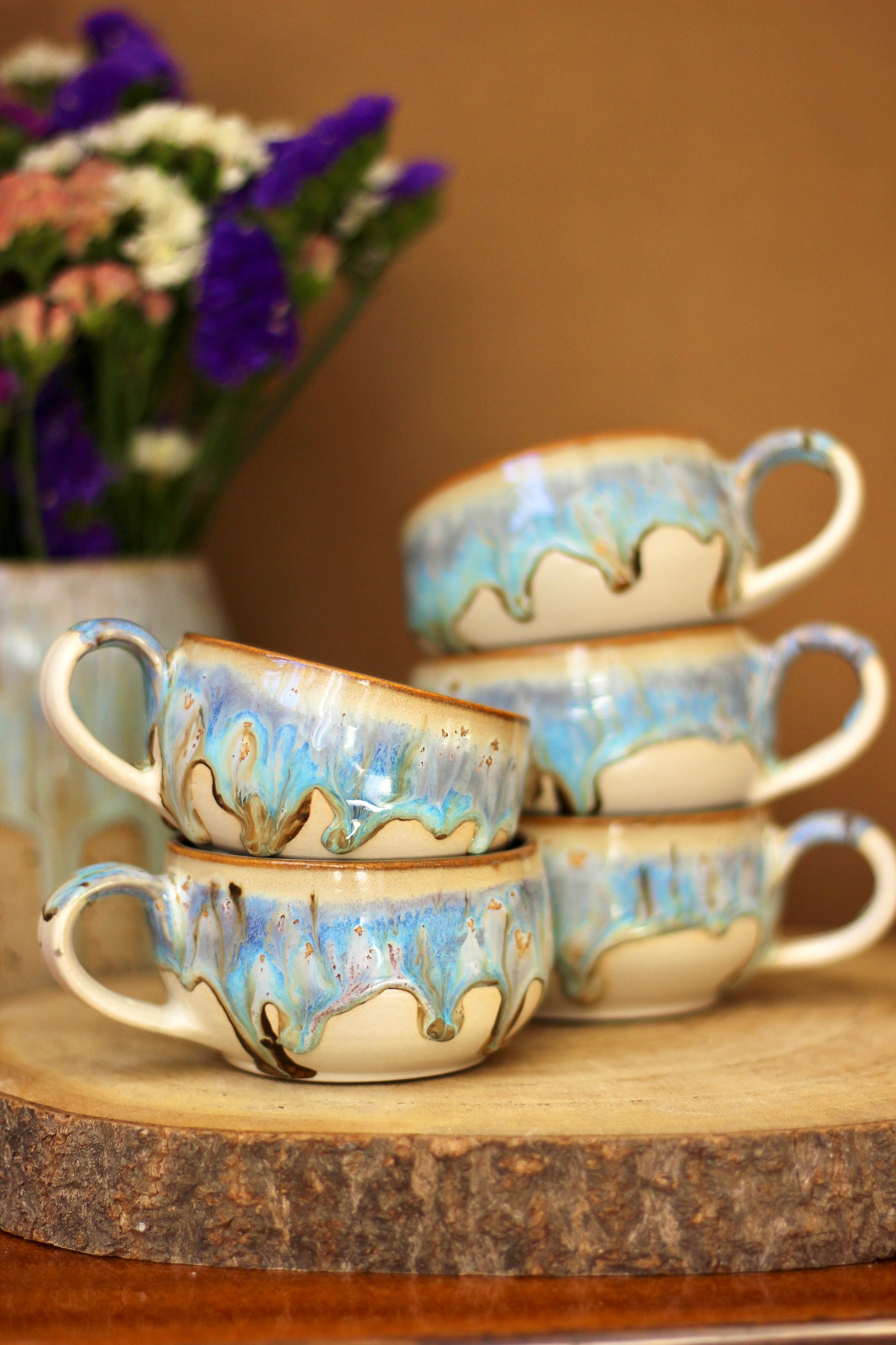 La taza está esmaltada con un esmalte agradable a la vista y al tacto. El interior está esmaltado con uno de los siguientes esmaltes: "Abedul, Vainilla Jaspeada, Sangría o Turquesa Texturizado". Vea el esmalte en la imagen. La base de la taza no está esmaltada.