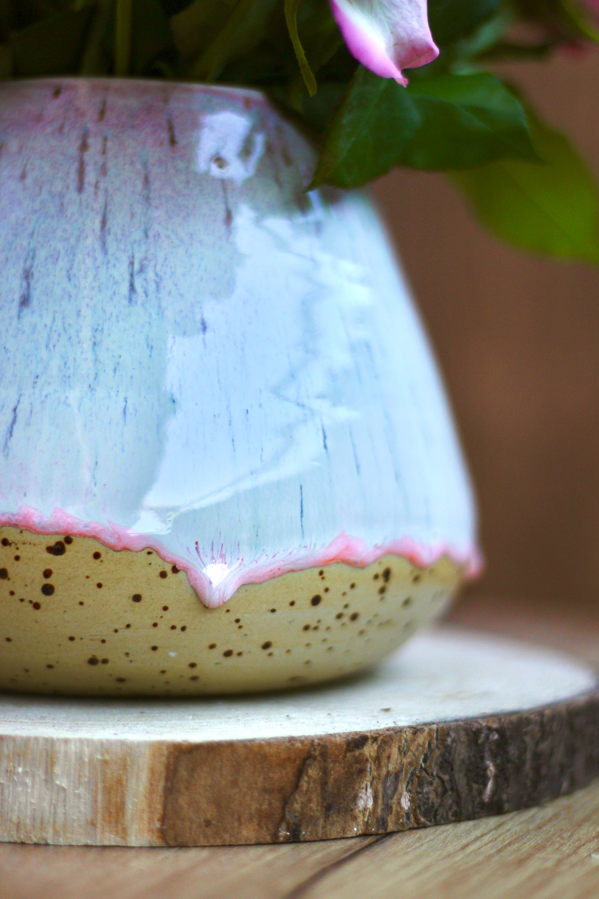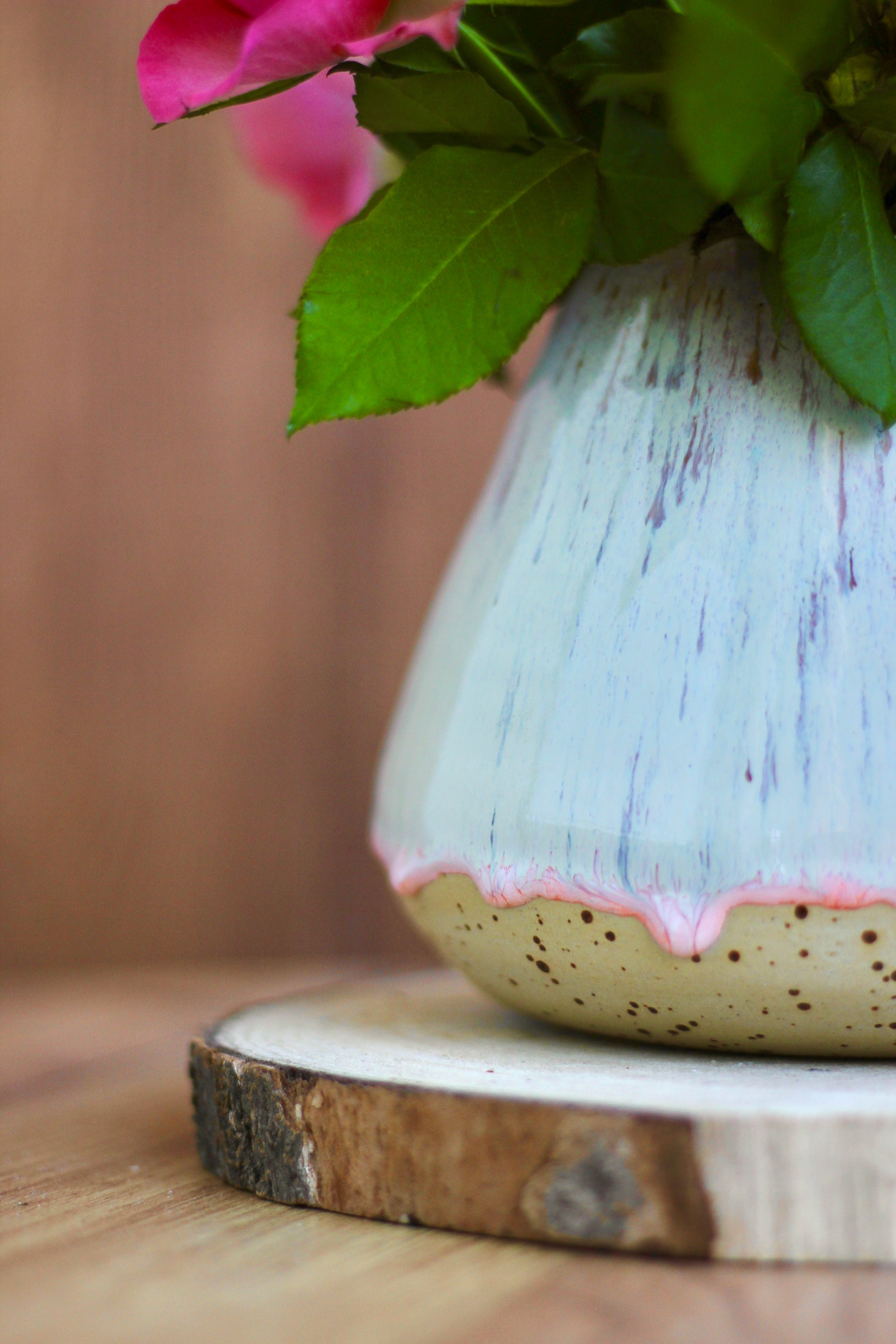 El jarrón de cerámica está elaborado en gres, torneado a mano.