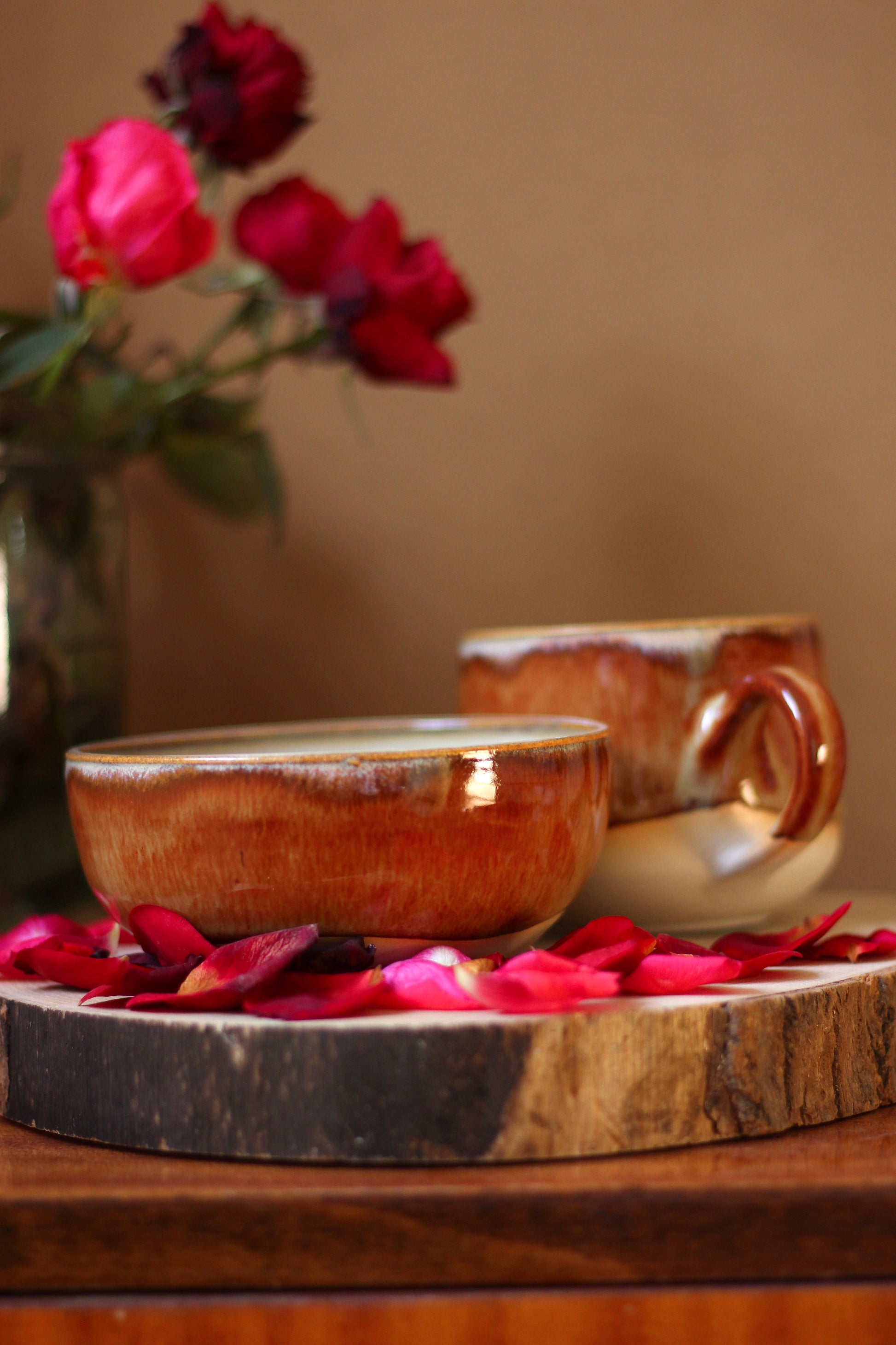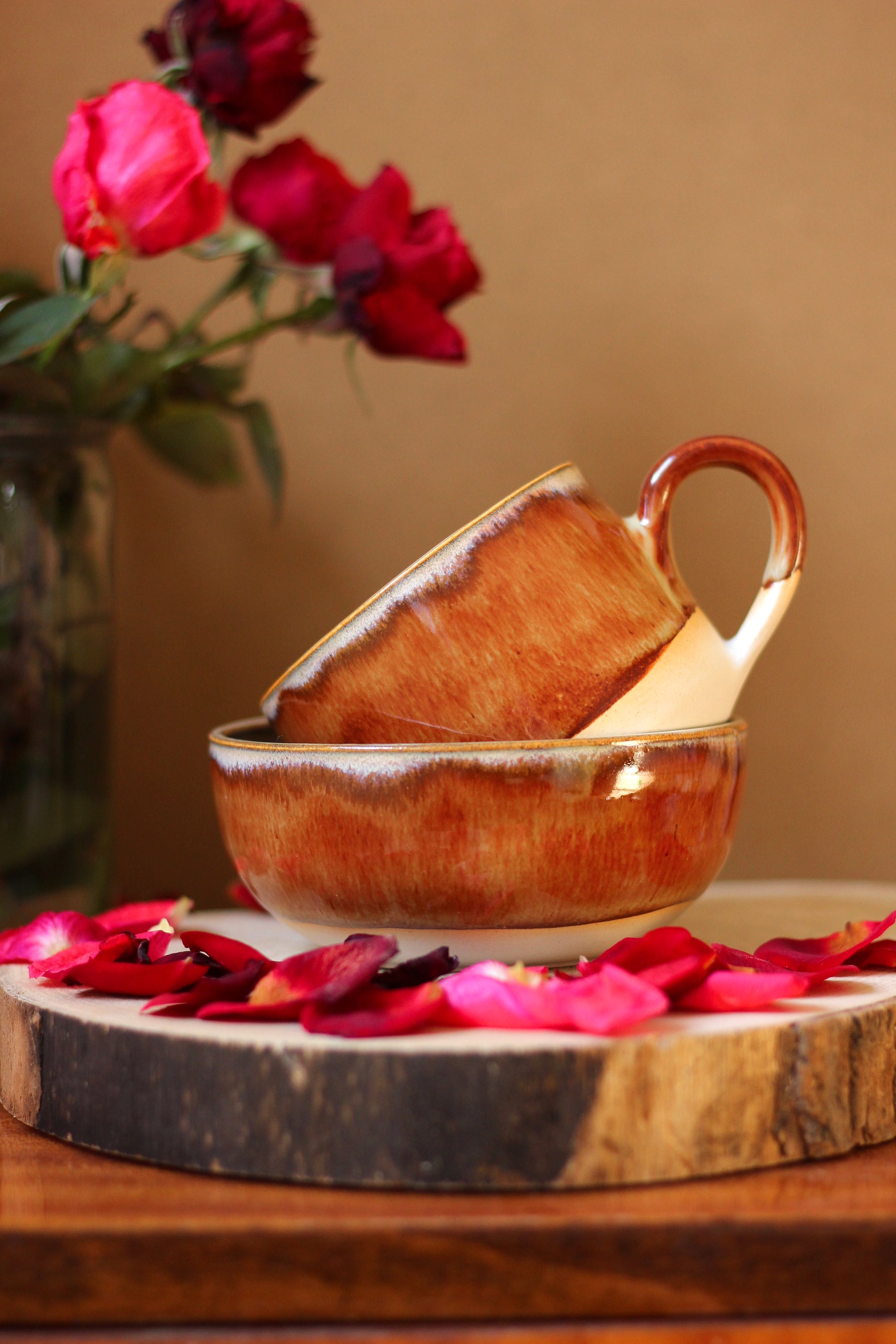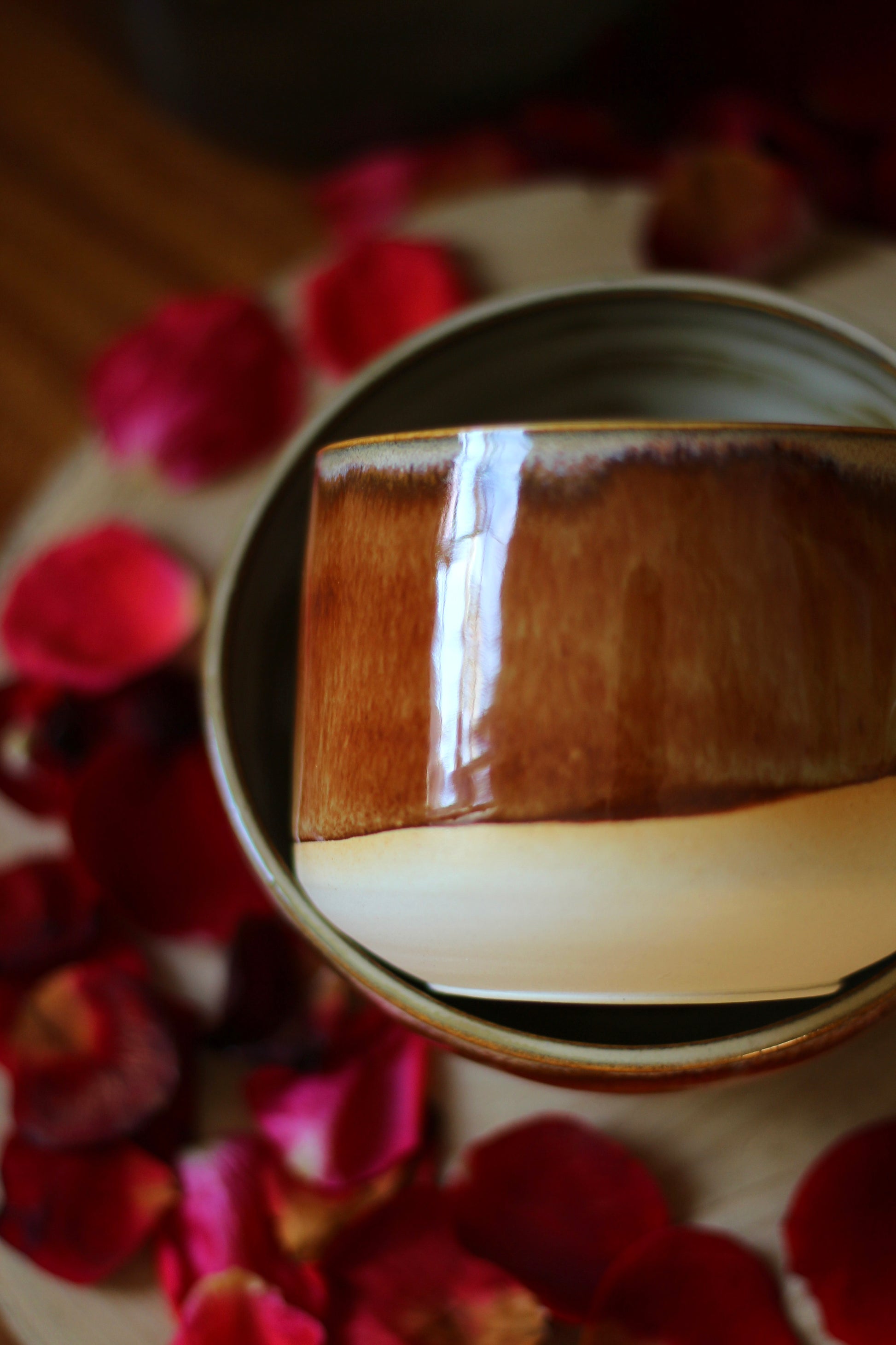 Šálka je z vonkajšej strany prijemná na dotyk. Vnútro šálky je glazúrované jednou z glazúr "Piesok, Bodkovaná vanilka, Ruža alebo Tyrkys". Viď foto vnútra šálky. Šálka je zo spodu neglazovaná.