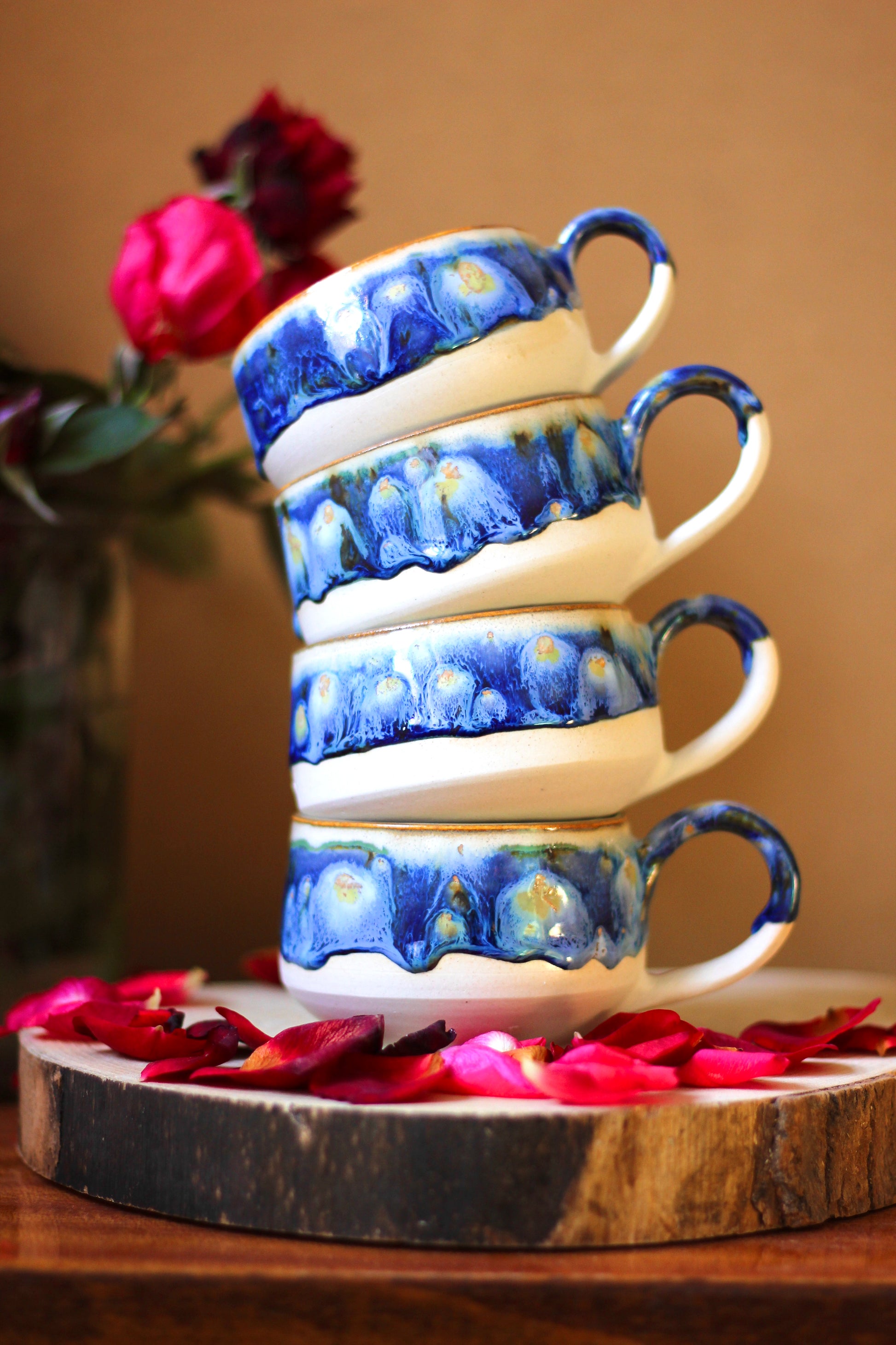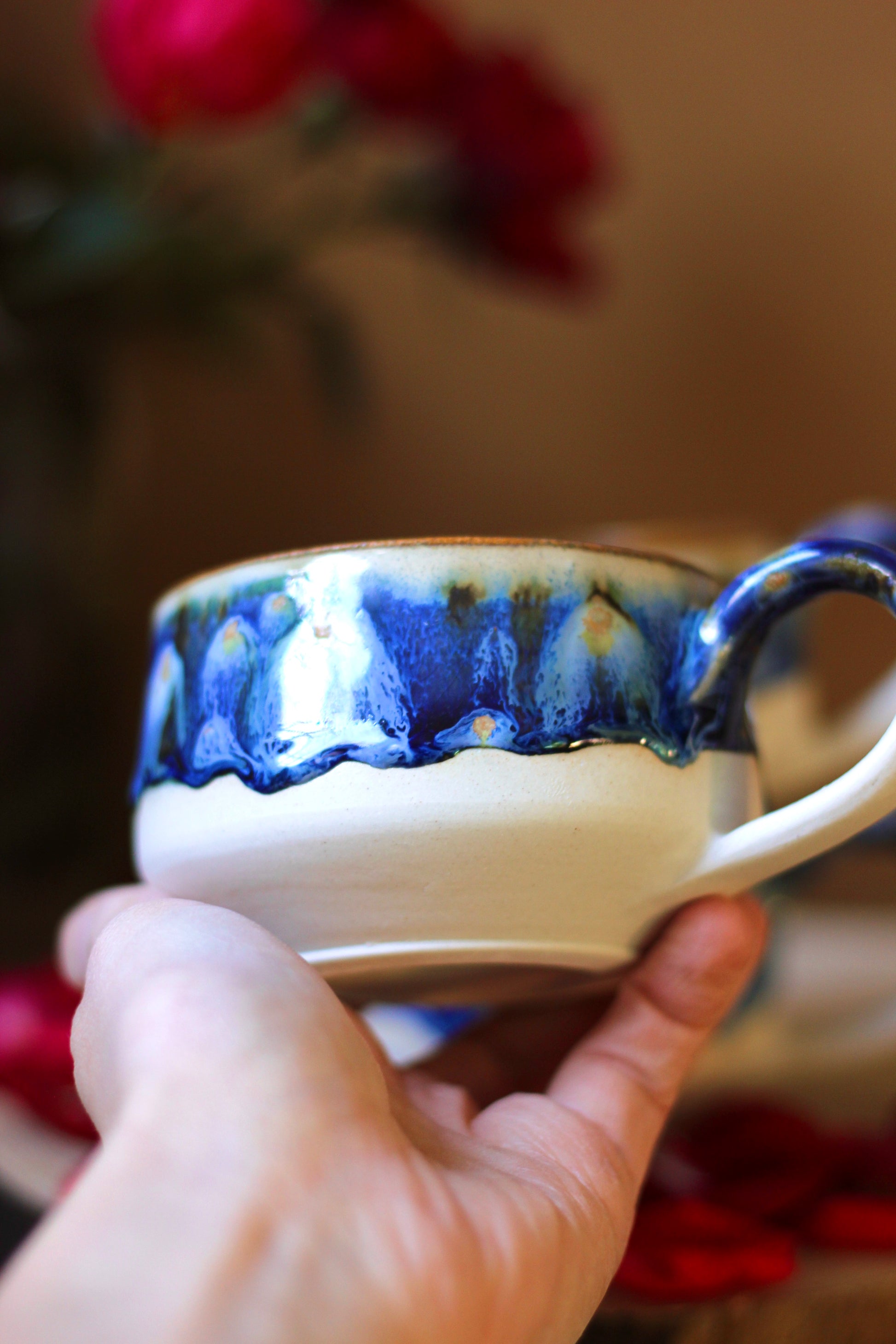 Šálka je z vonkajšej strany prijemná na dotyk. Vnútro šálky je glazúrované jednou z glazúr "Piesok, Bodkovaná vanilka, Ruža alebo Tyrkys". Viď foto vnútra šálky. Šálka je zo spodu neglazovaná.