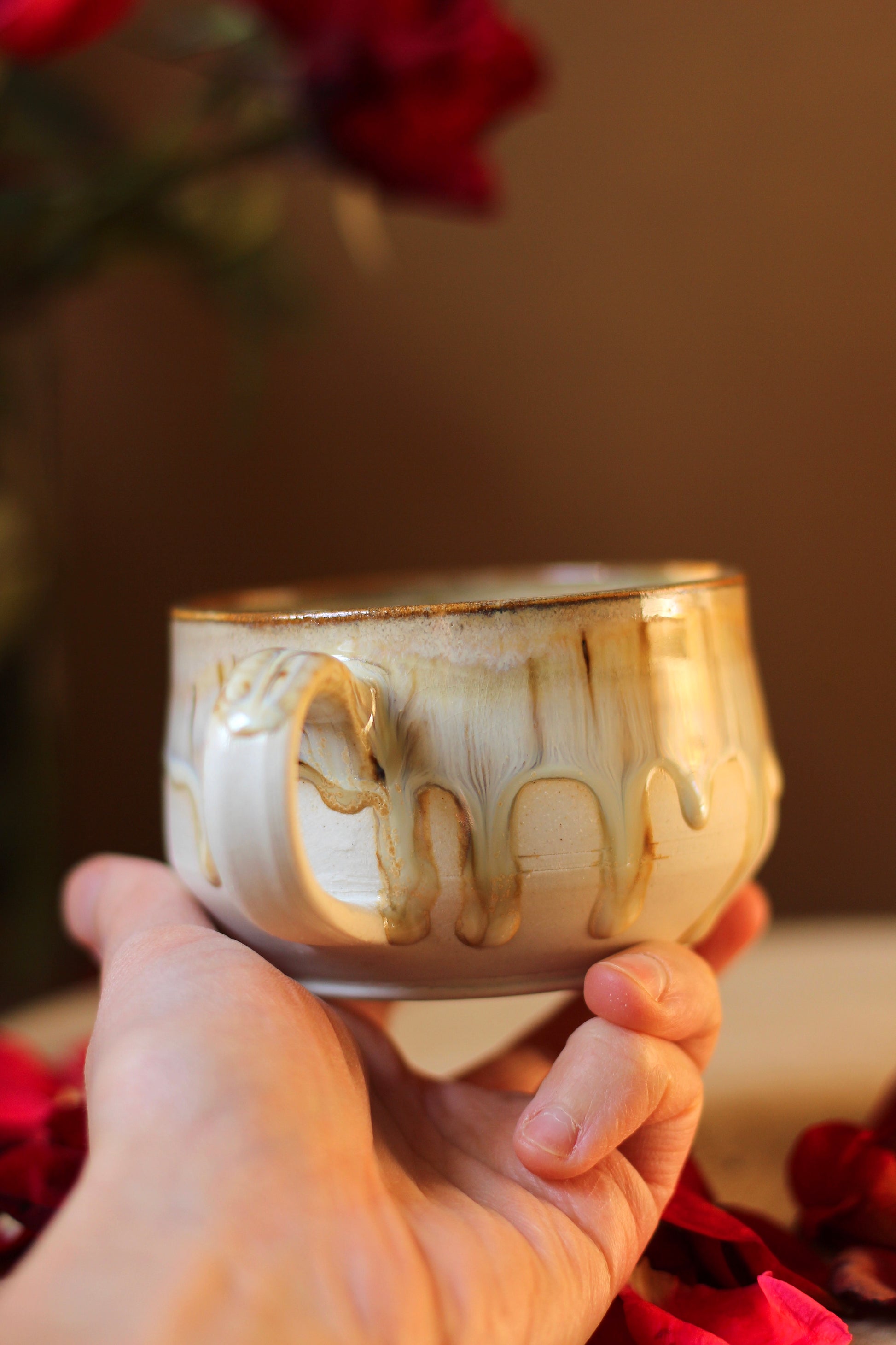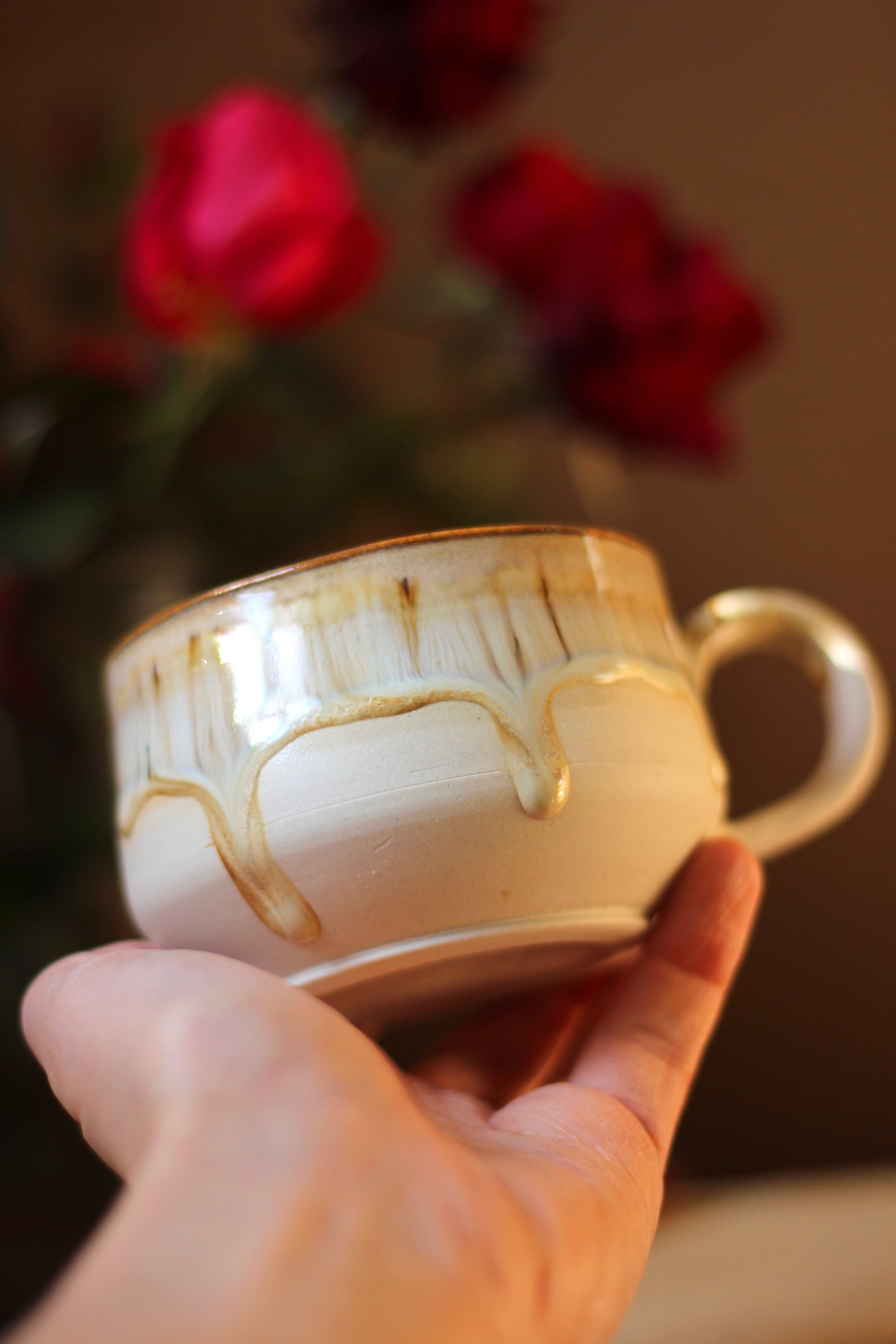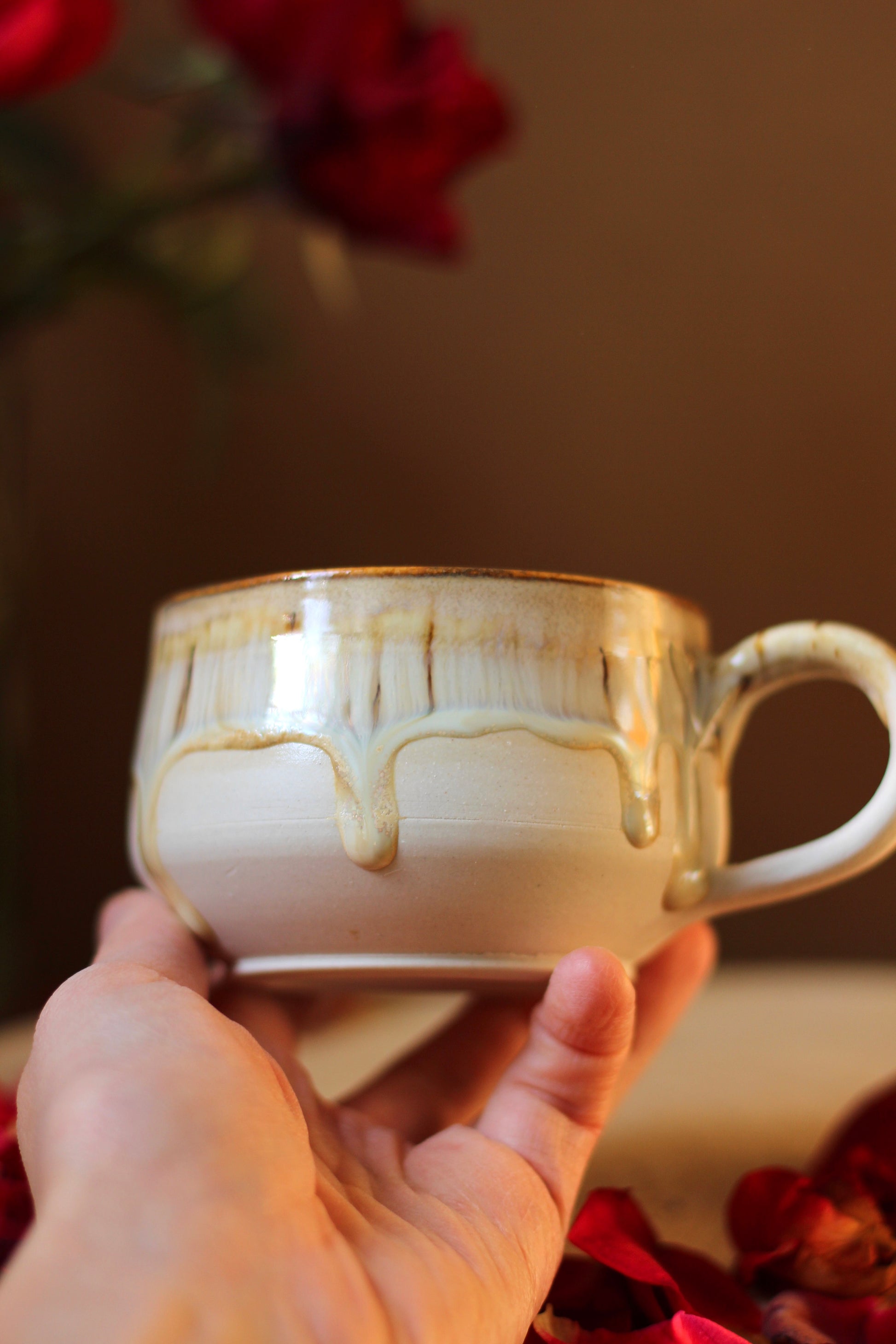 Šálka je z vonkajšej strany prijemná na dotyk. Vnútro šálky je glazúrované jednou z glazúr "Piesok, Bodkovaná vanilka, Ruža alebo Tyrkys". Viď foto vnútra šálky. Šálka je zo spodu neglazovaná.