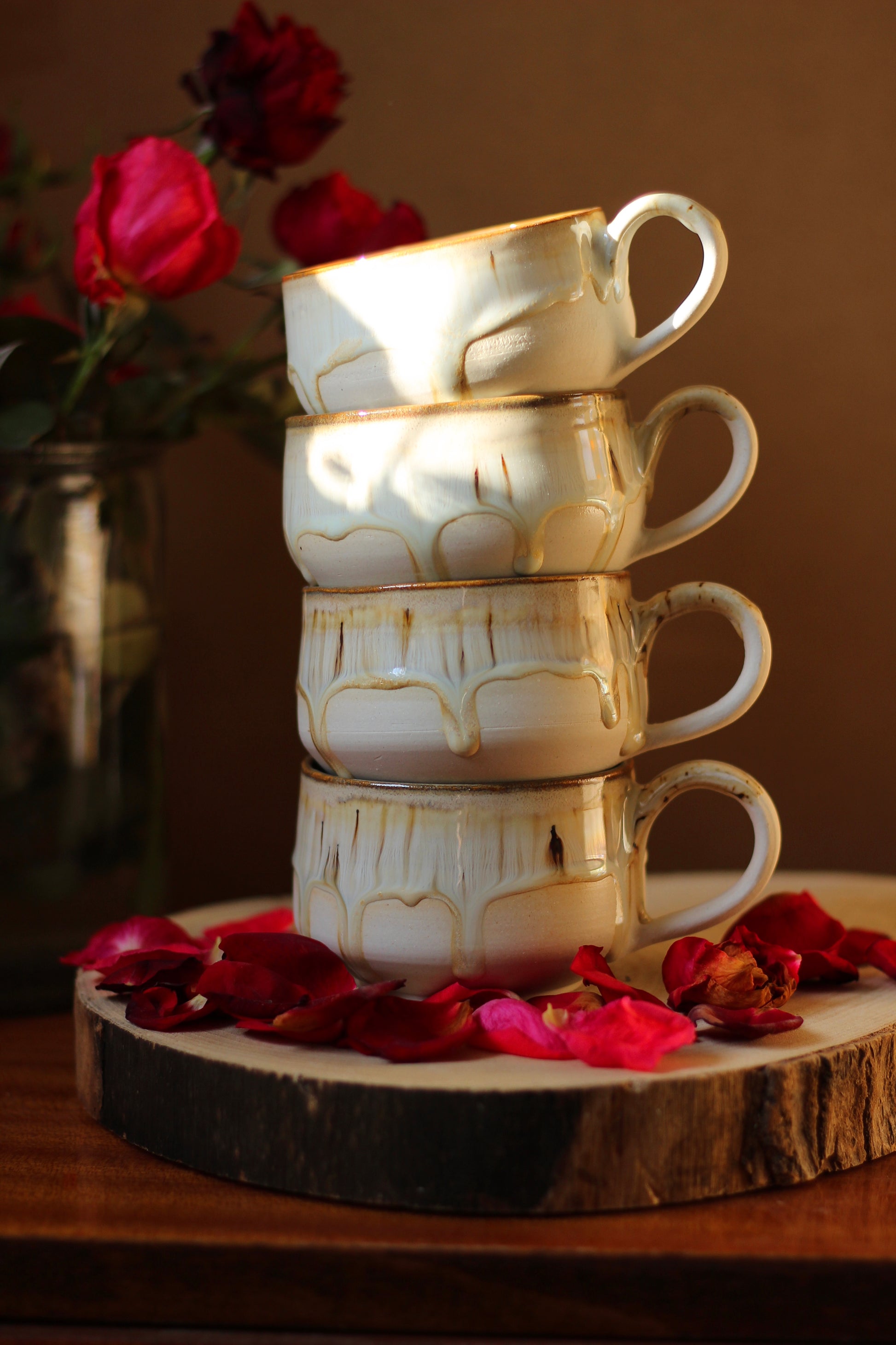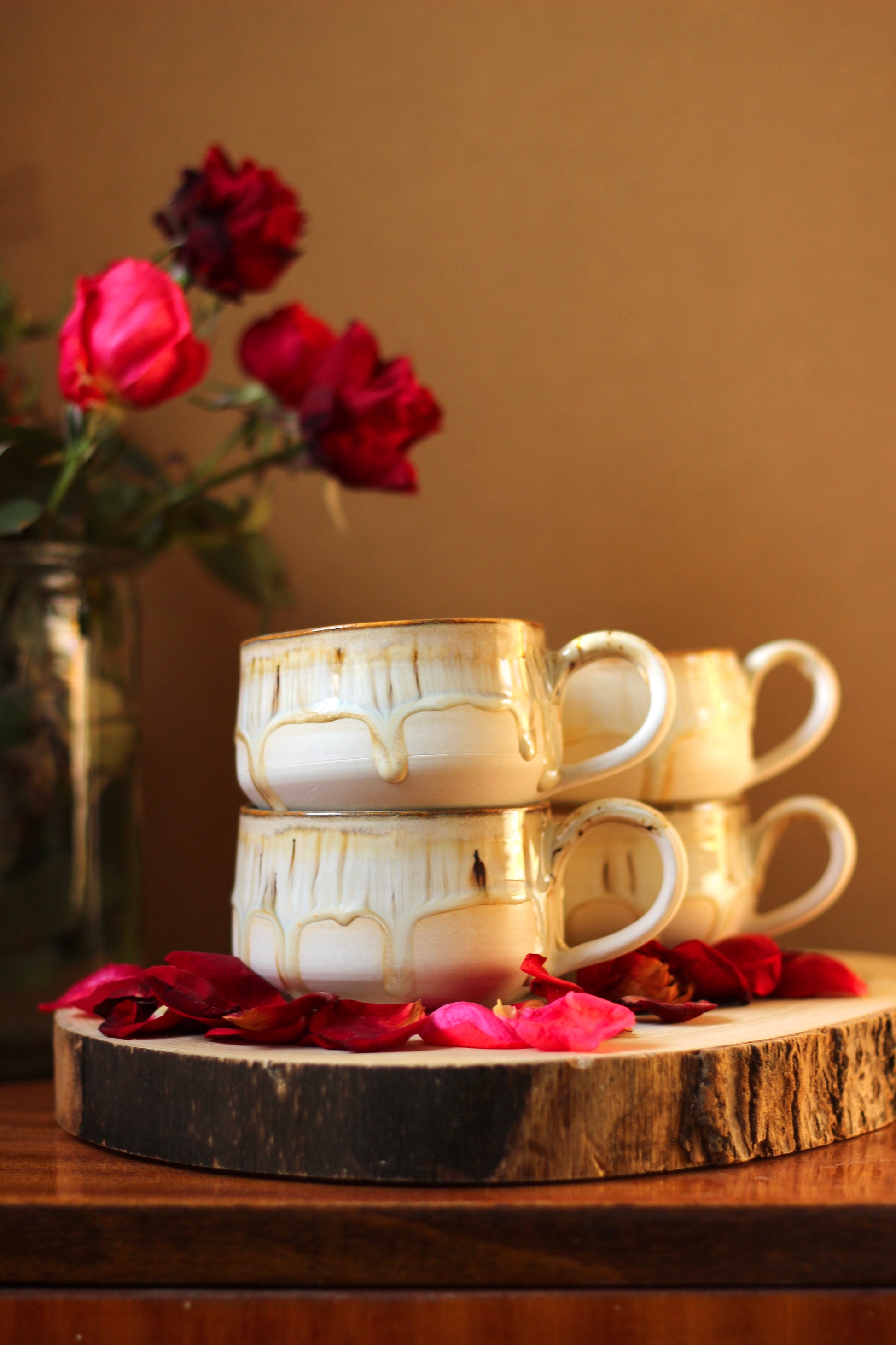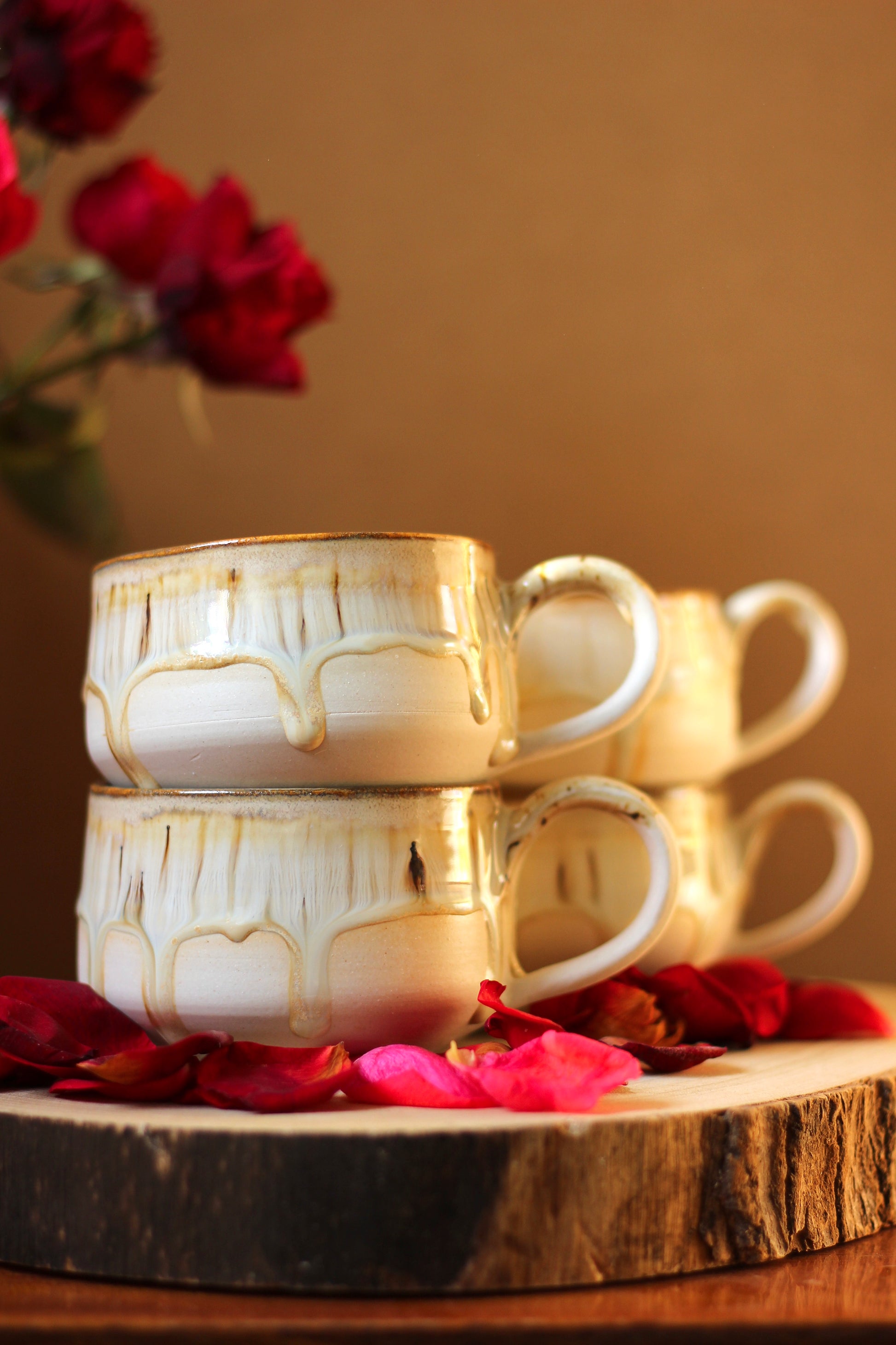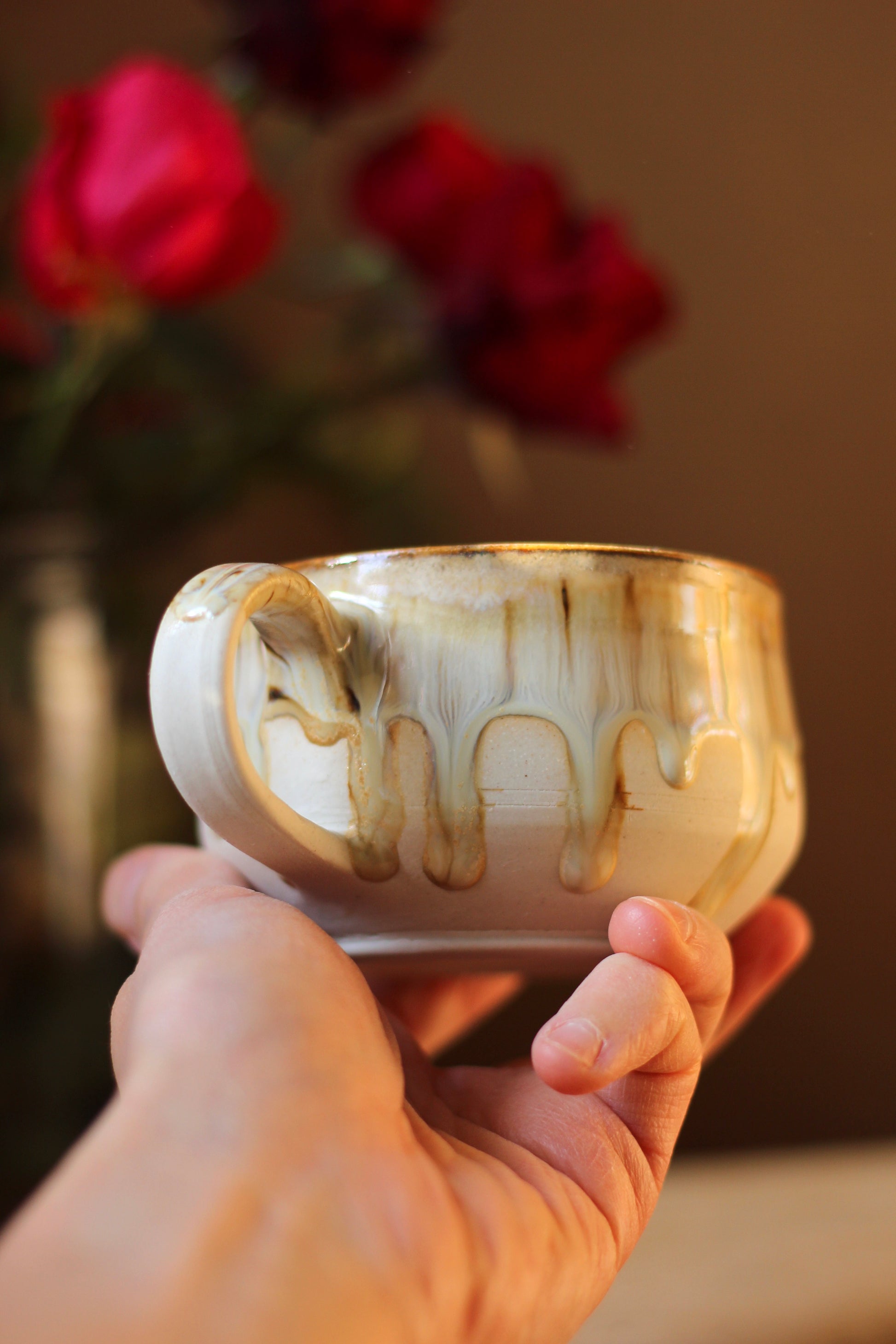 Šálka je z vonkajšej strany prijemná na dotyk. Vnútro šálky je glazúrované jednou z glazúr "Piesok, Bodkovaná vanilka, Ruža alebo Tyrkys". Viď foto vnútra šálky. Šálka je zo spodu neglazovaná.