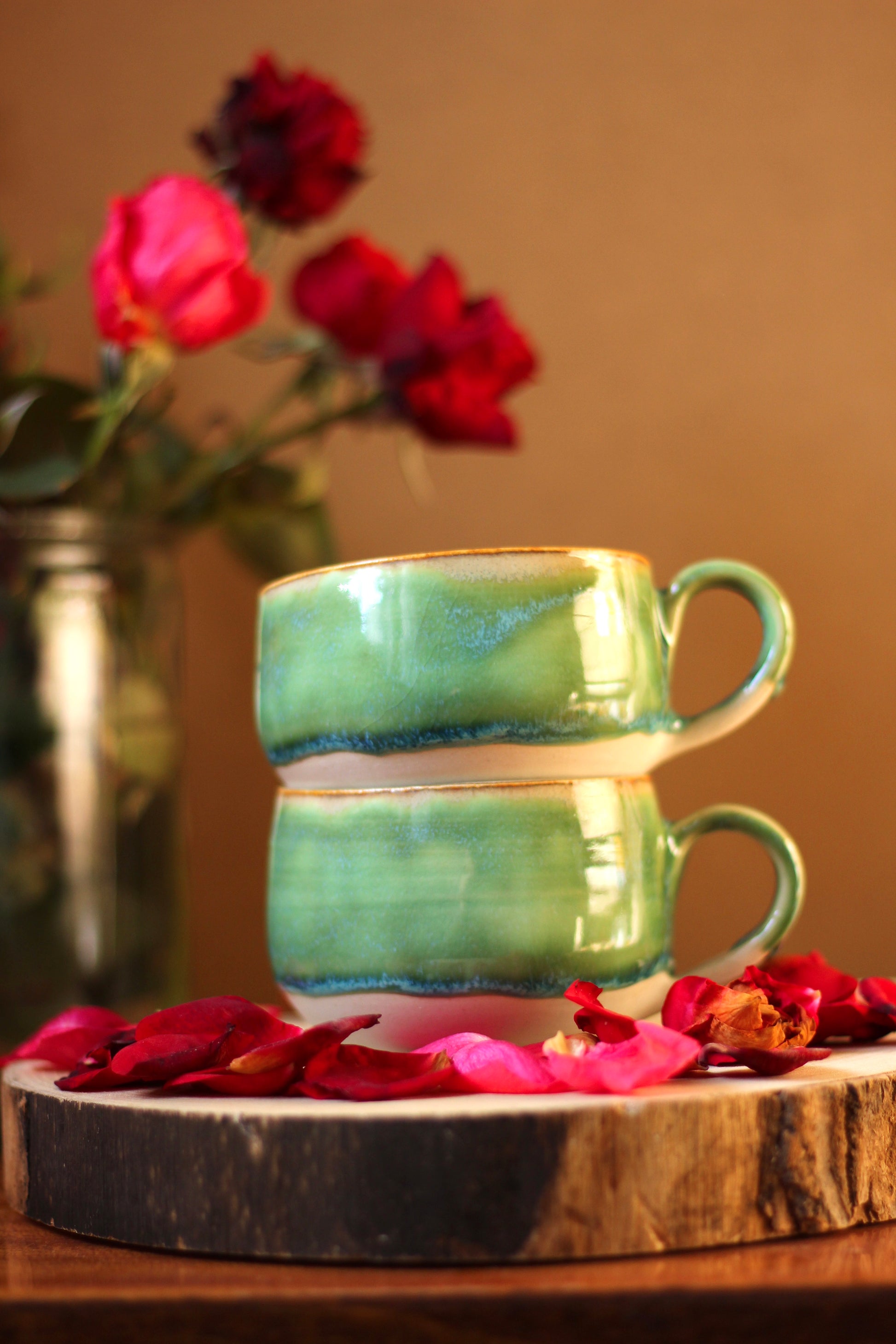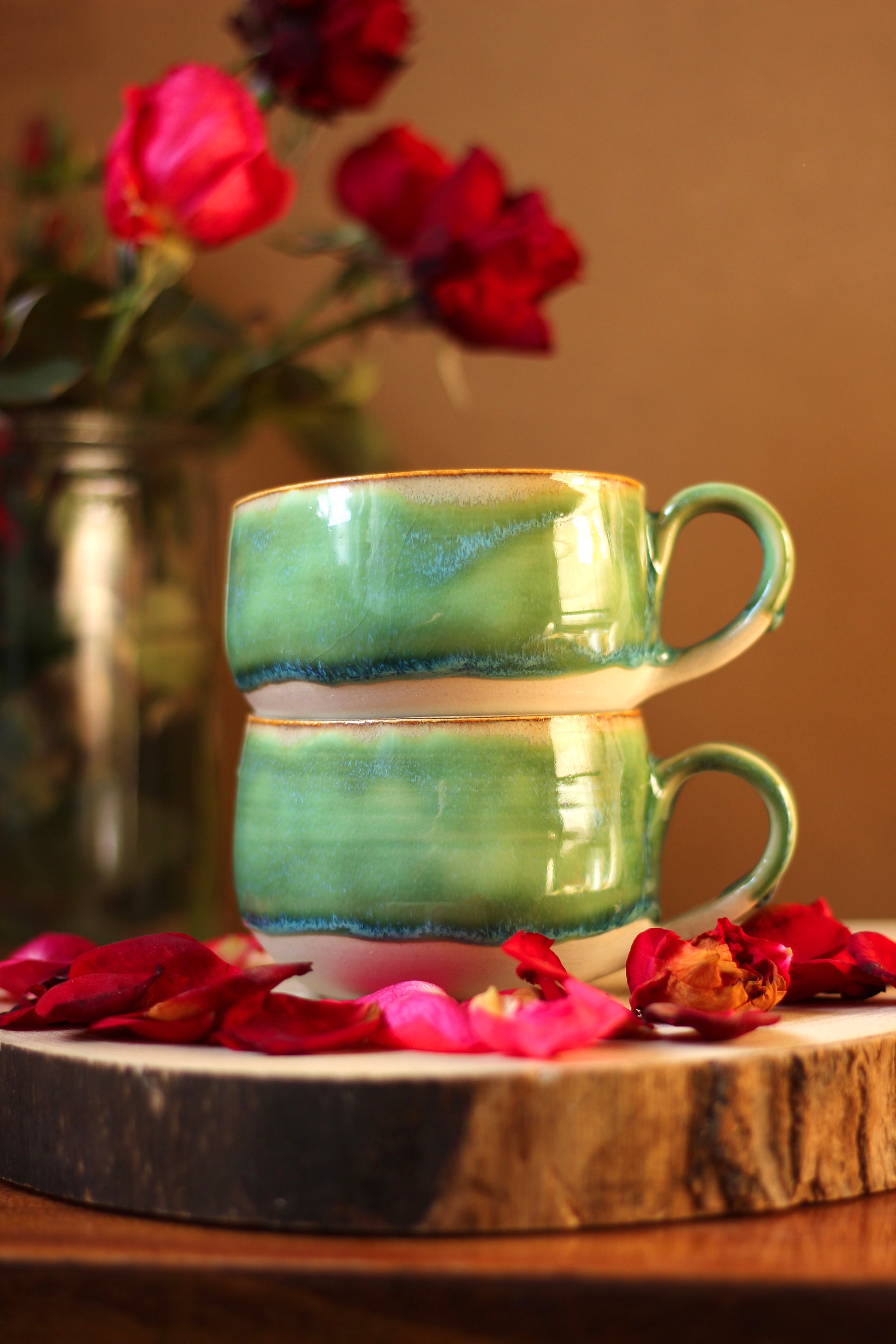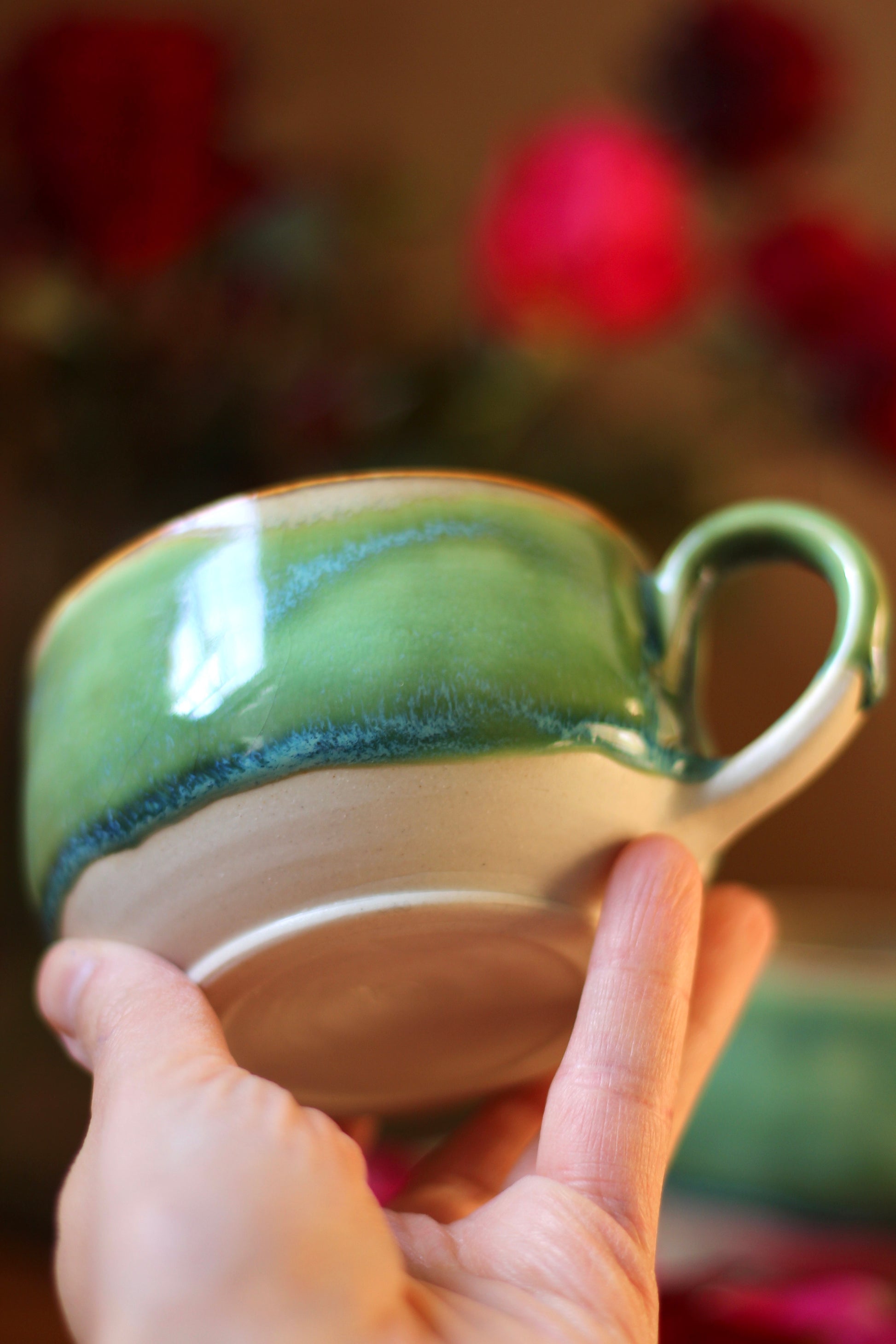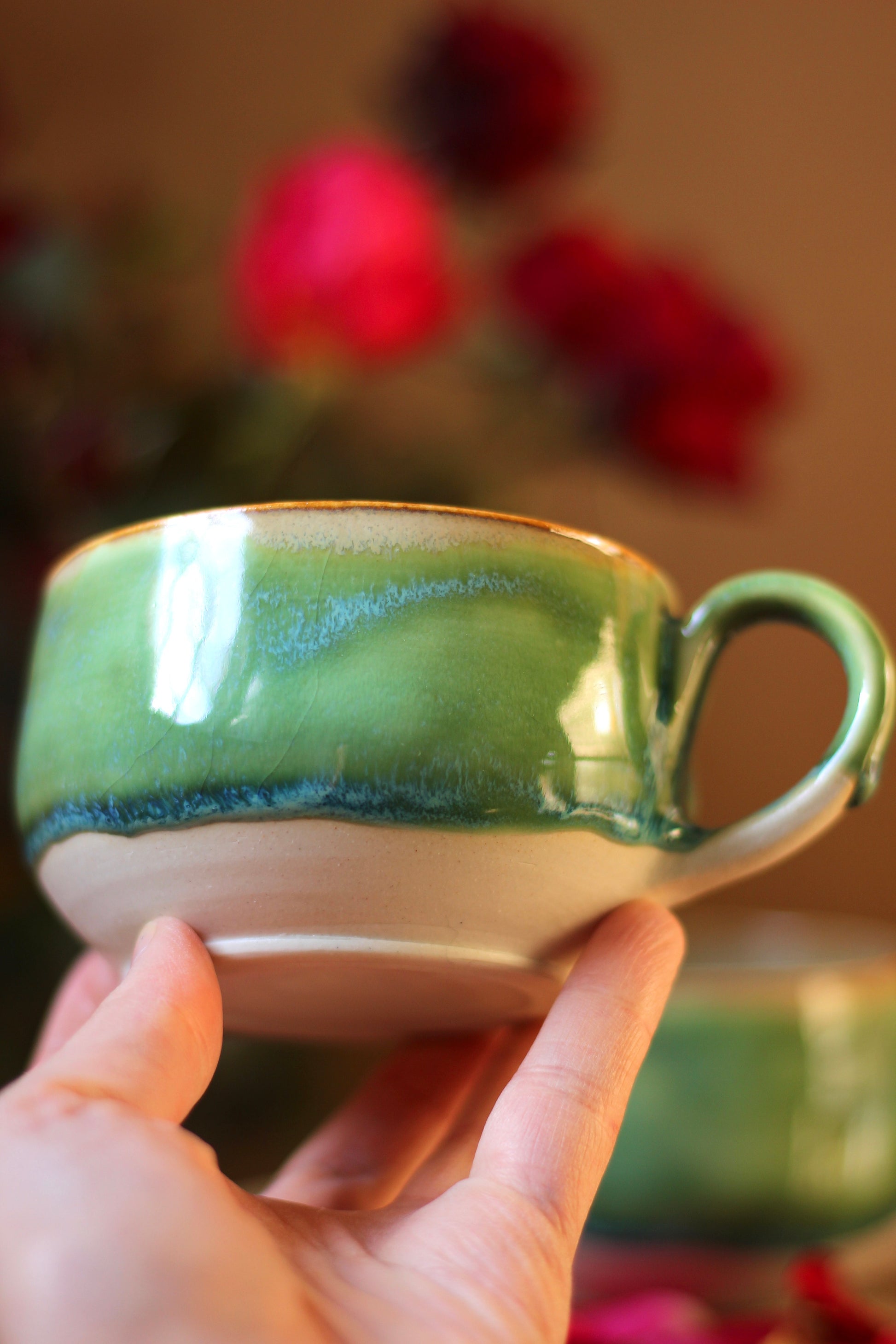 Šálka je z vonkajšej strany prijemná na dotyk. Vnútro šálky je glazúrované jednou z glazúr "Piesok, Bodkovaná vanilka, Ruža alebo Tyrkys". Viď foto vnútra šálky. Šálka je zo spodu neglazovaná.