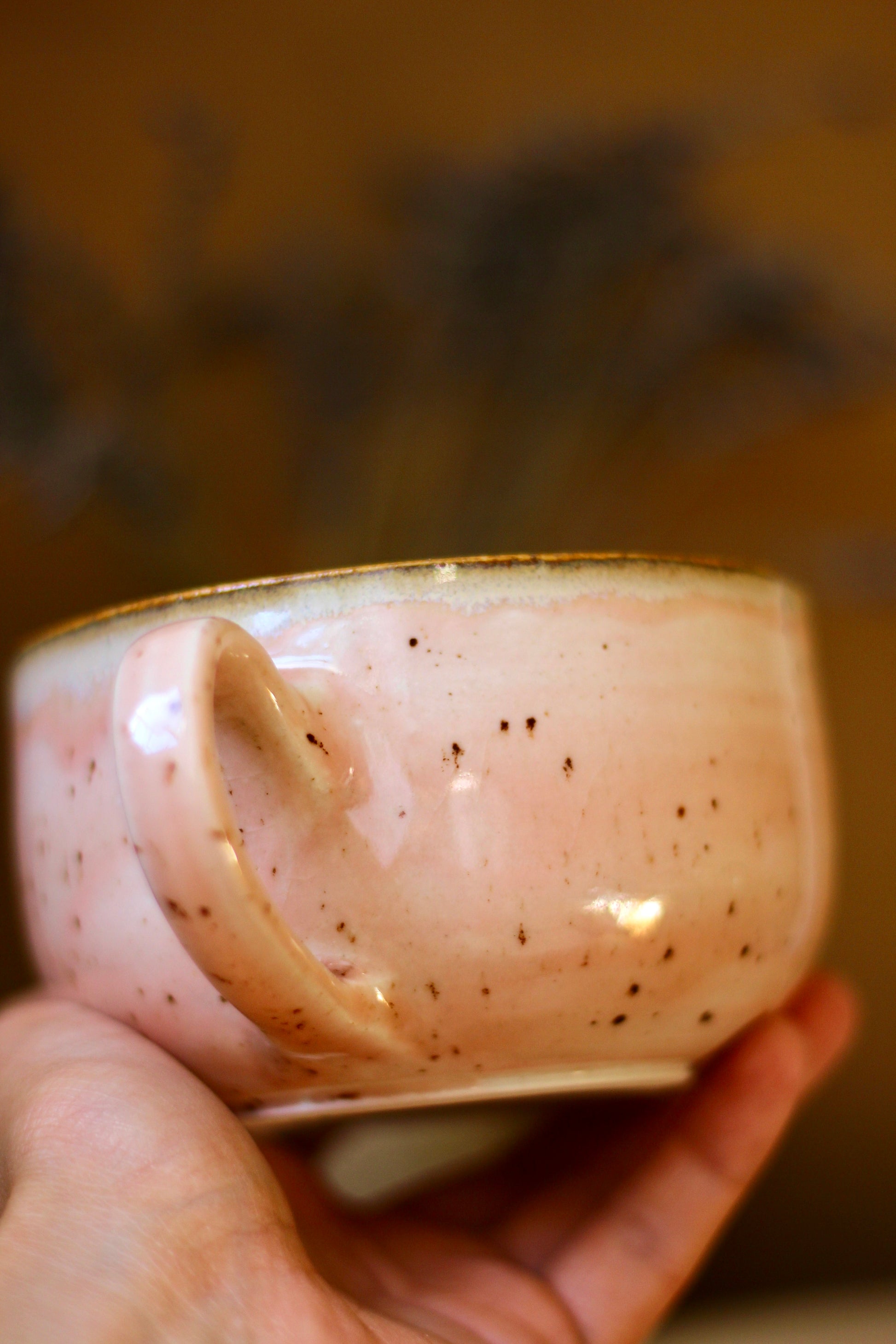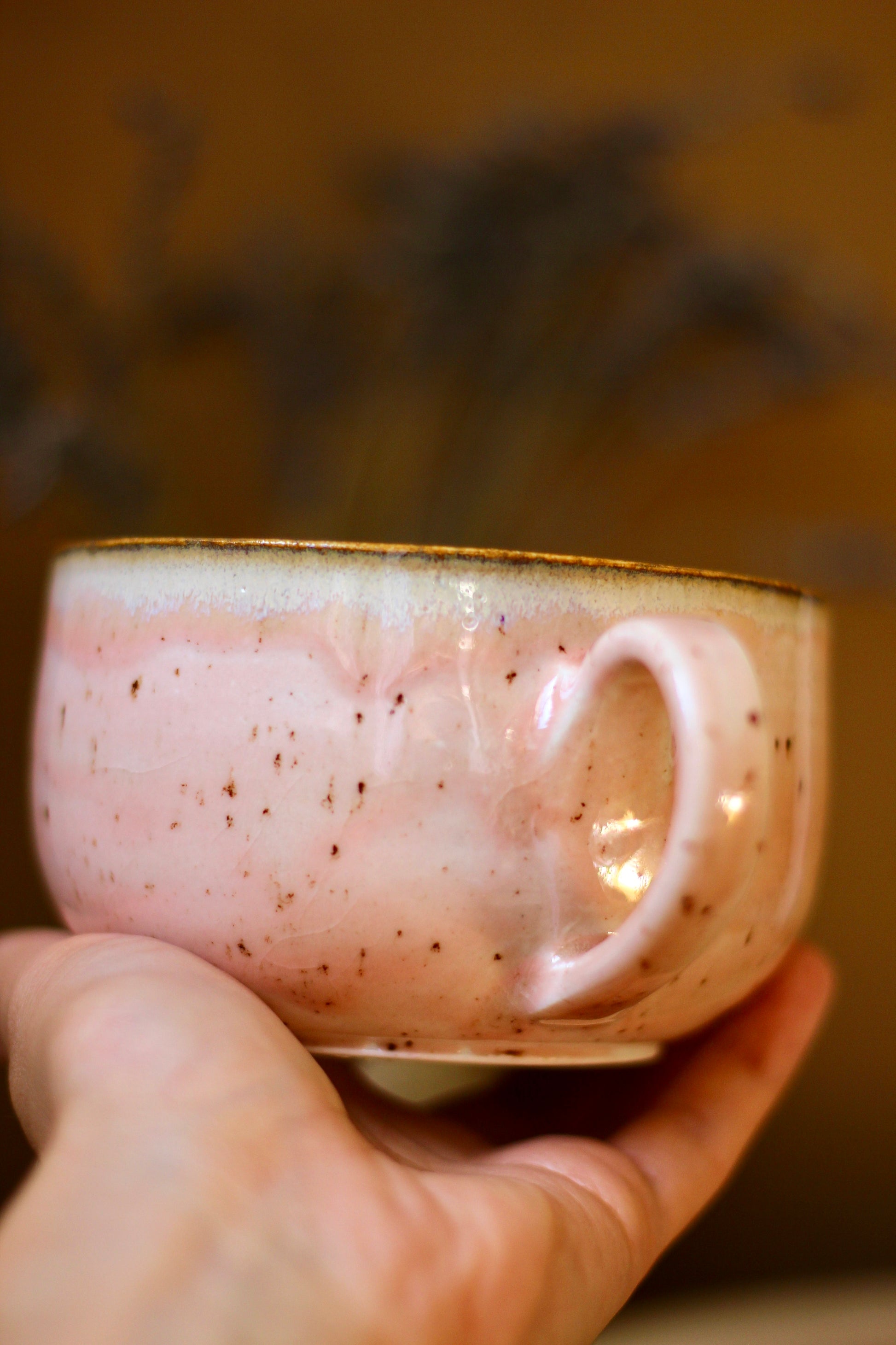 Šálka je z vonkajšej strany prijemná na dotyk. Vnútro šálky je glazúrované jednou z glazúr "Piesok, Bodkovaná vanilka, Ruža alebo Tyrkys". Viď foto vnútra šálky. Šálka je zo spodu neglazovaná.