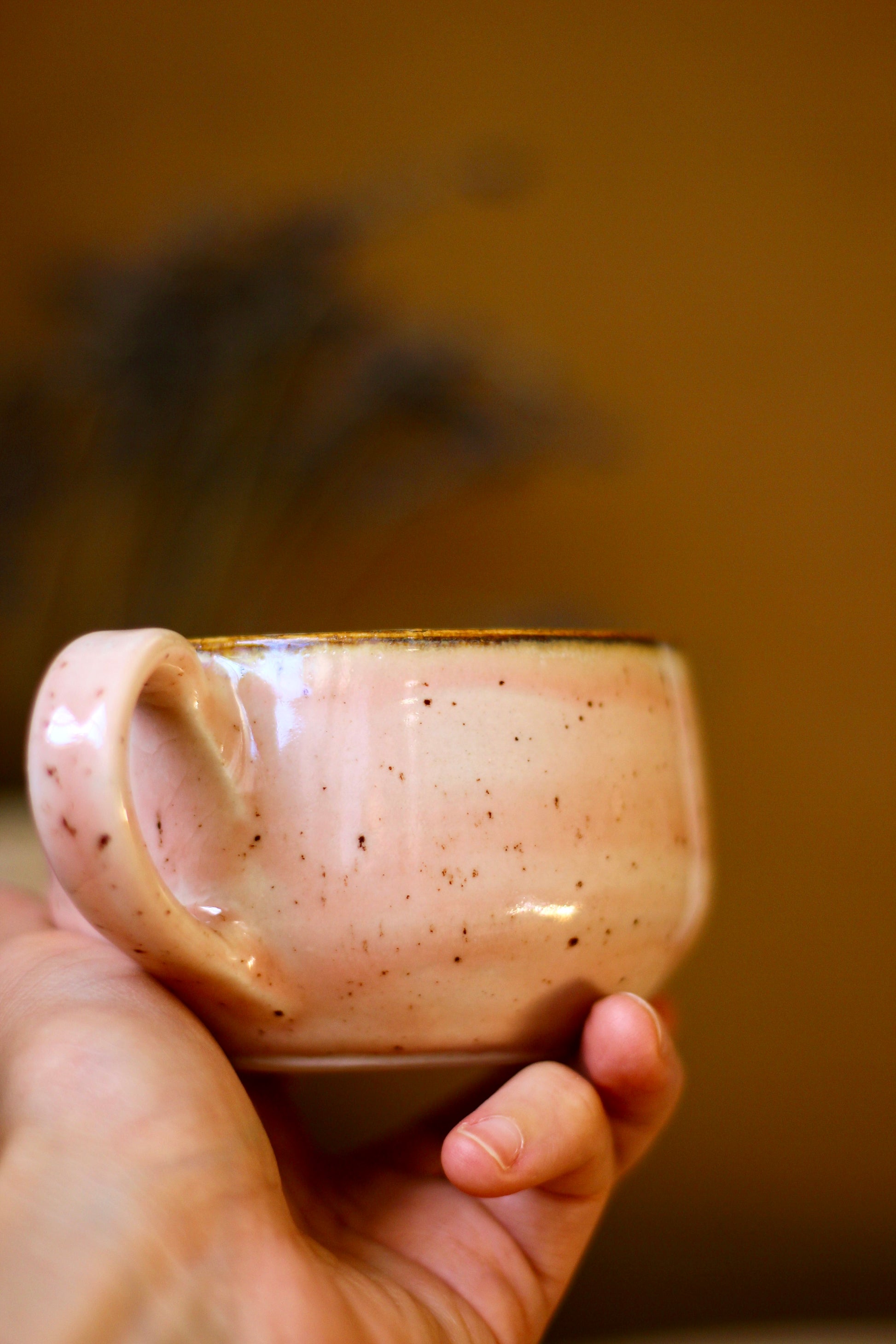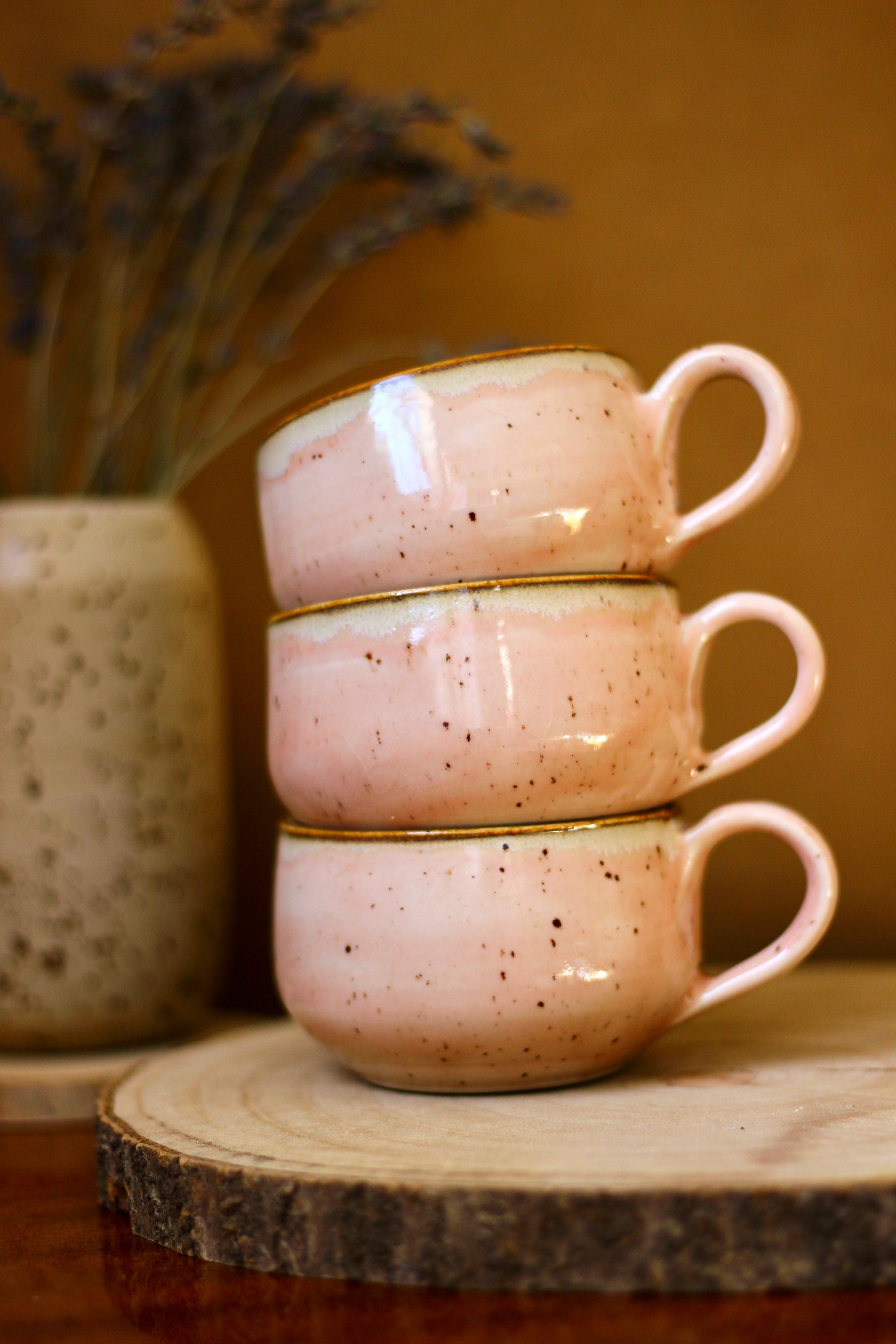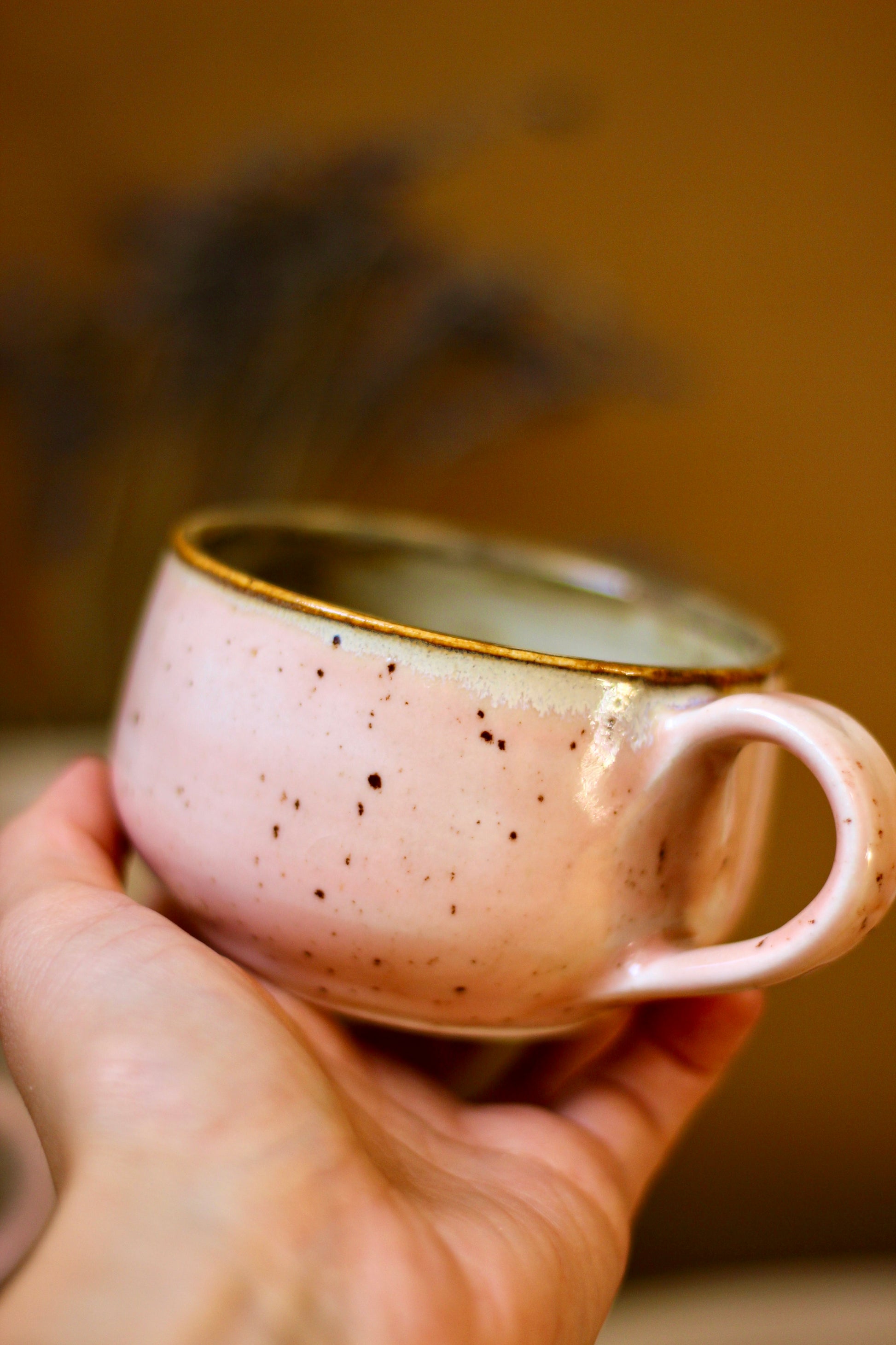 Šálka je z vonkajšej strany prijemná na dotyk. Vnútro šálky je glazúrované jednou z glazúr "Piesok, Bodkovaná vanilka, Ruža alebo Tyrkys". Viď foto vnútra šálky. Šálka je zo spodu neglazovaná.