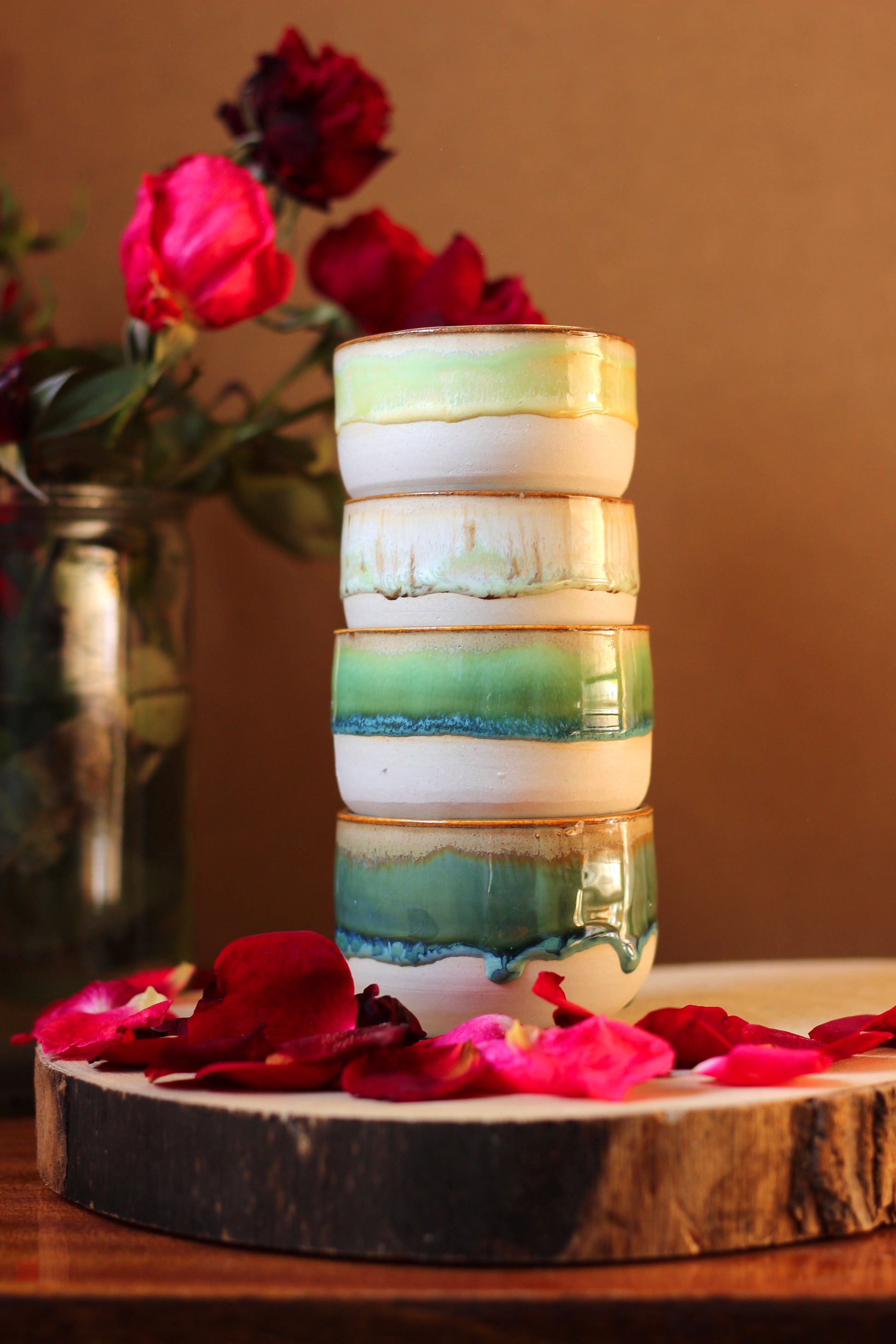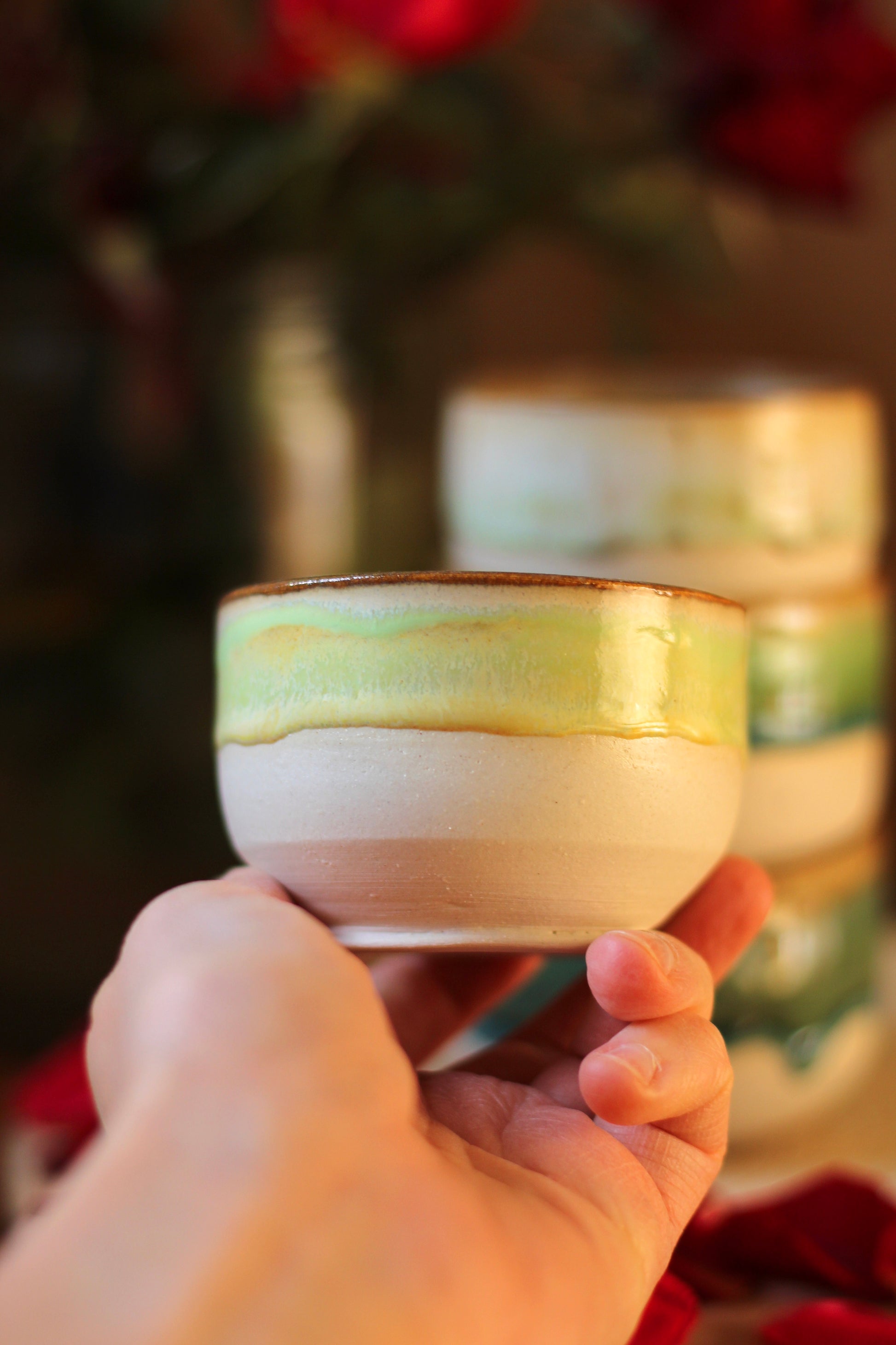 Keramika je z vonkajšej strany prijemná na dotyk. Vnútro šálky je glazúrované jednou z glazúr "Piesok, Bodkovaná vanilka, Ruža alebo Tyrkys". Viď foto vnútra šálky. Šálka je zo spodu neglazovaná.
