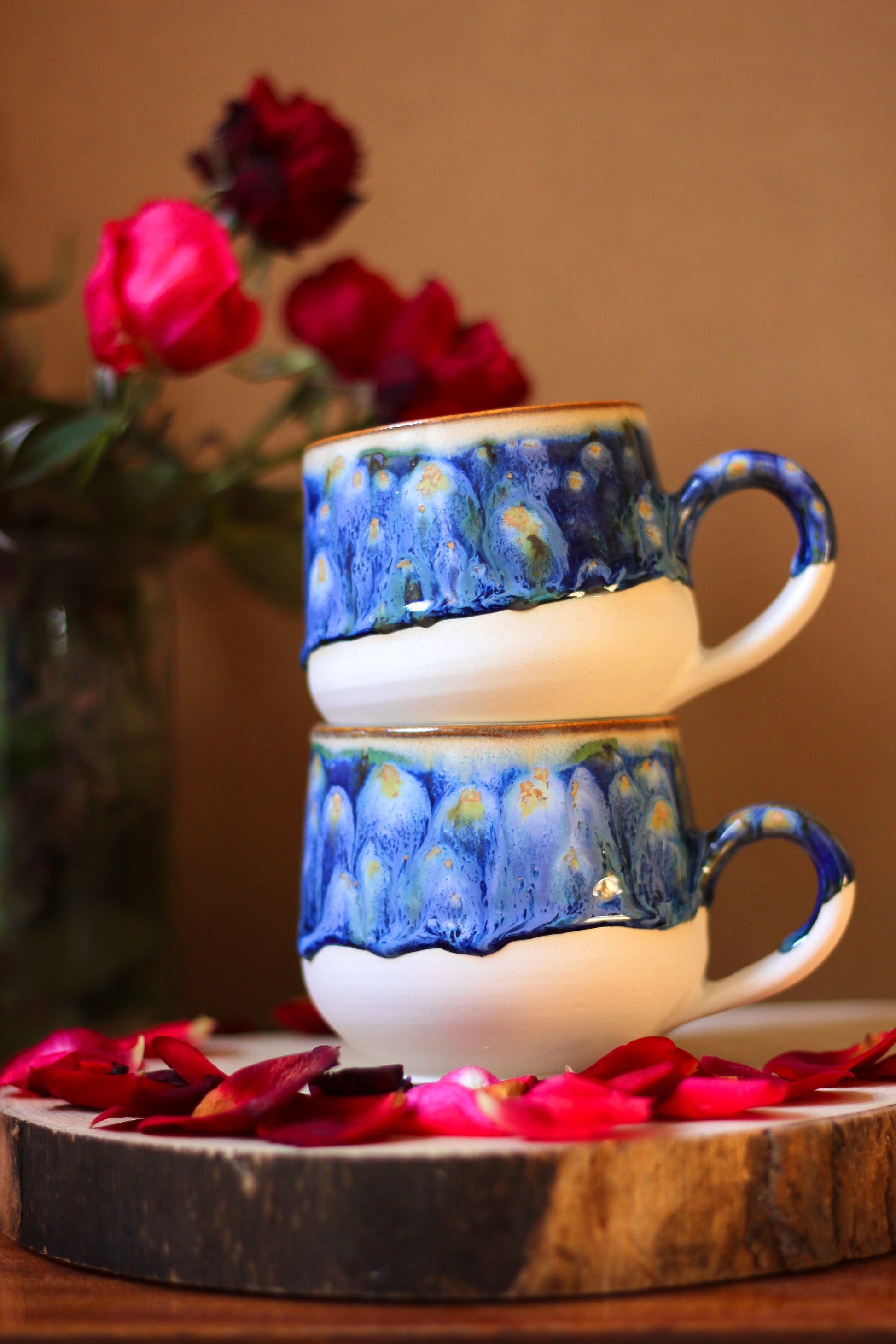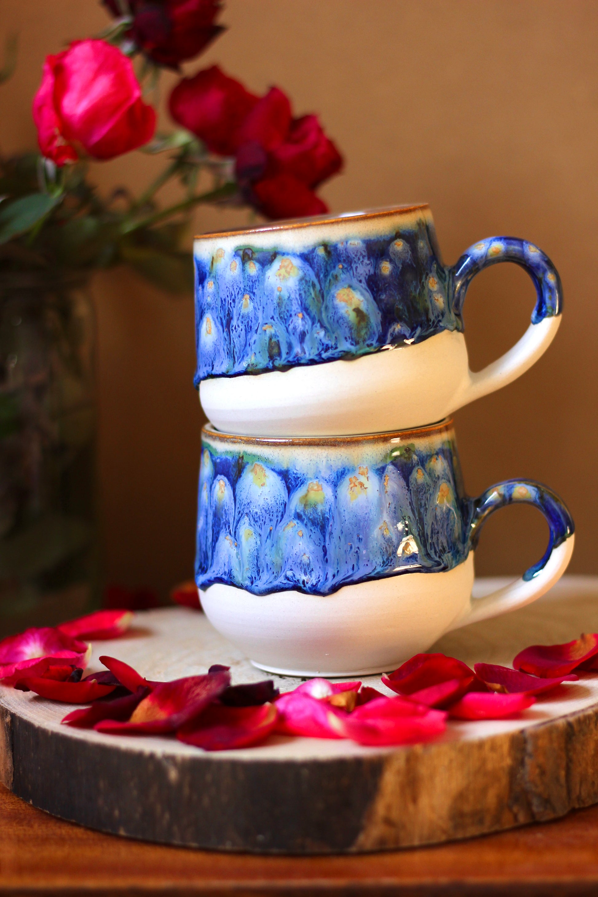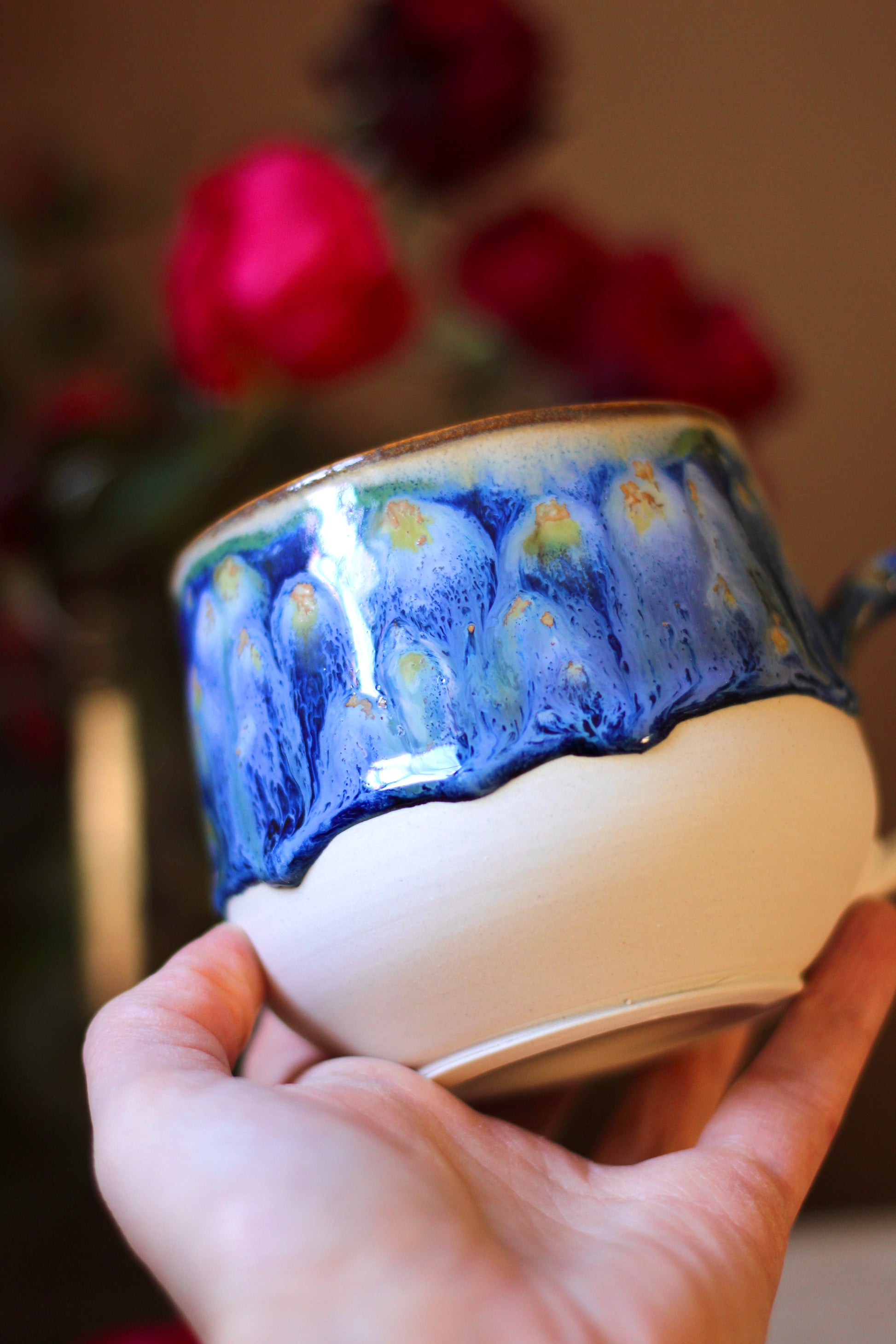 Šálka je z vonkajšej strany prijemná na dotyk. Vnútro šálky je glazúrované jednou z glazúr "Piesok, Bodkovaná vanilka, Ruža alebo Tyrkys". Viď foto vnútra šálky. Šálka je zo spodu neglazovaná.