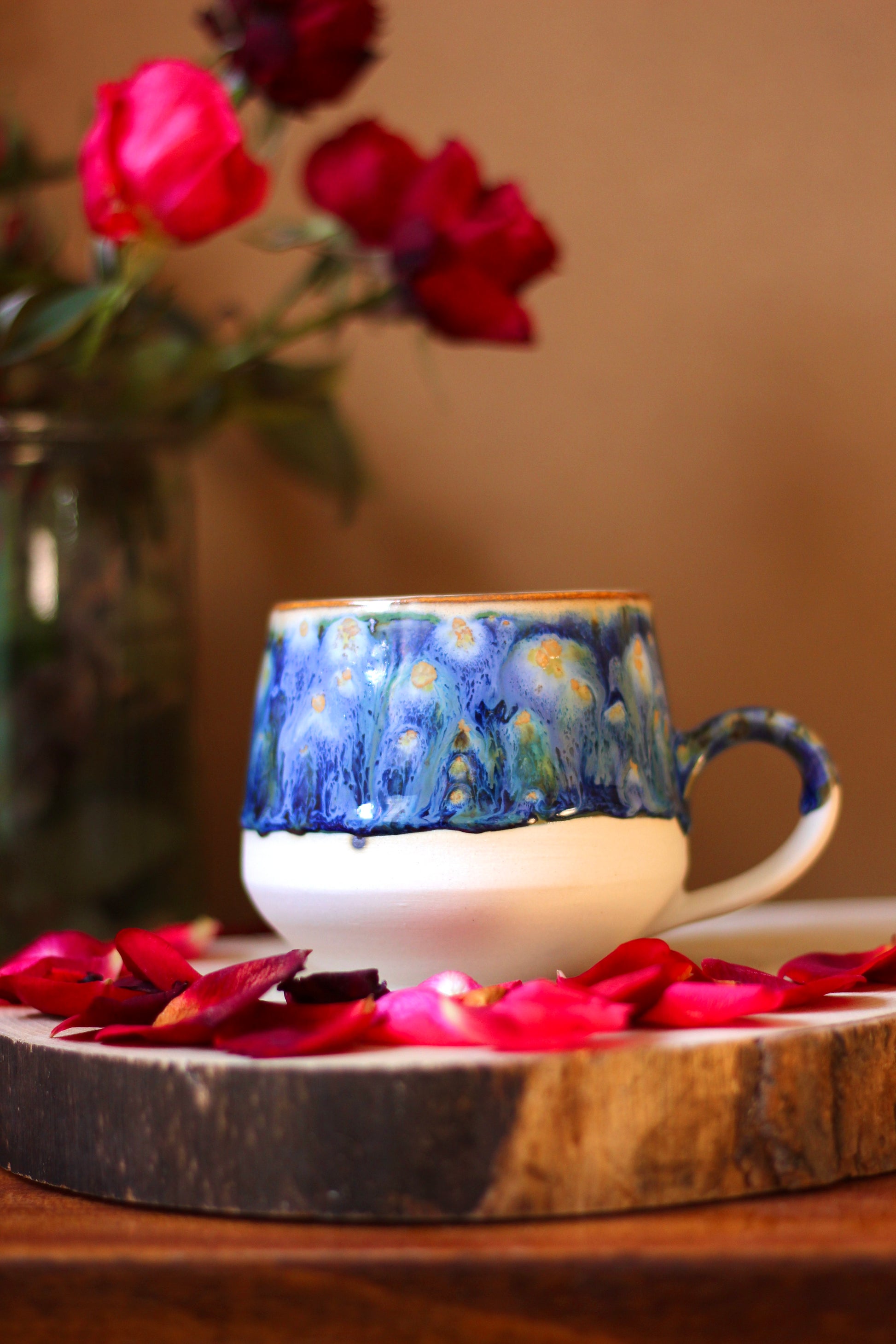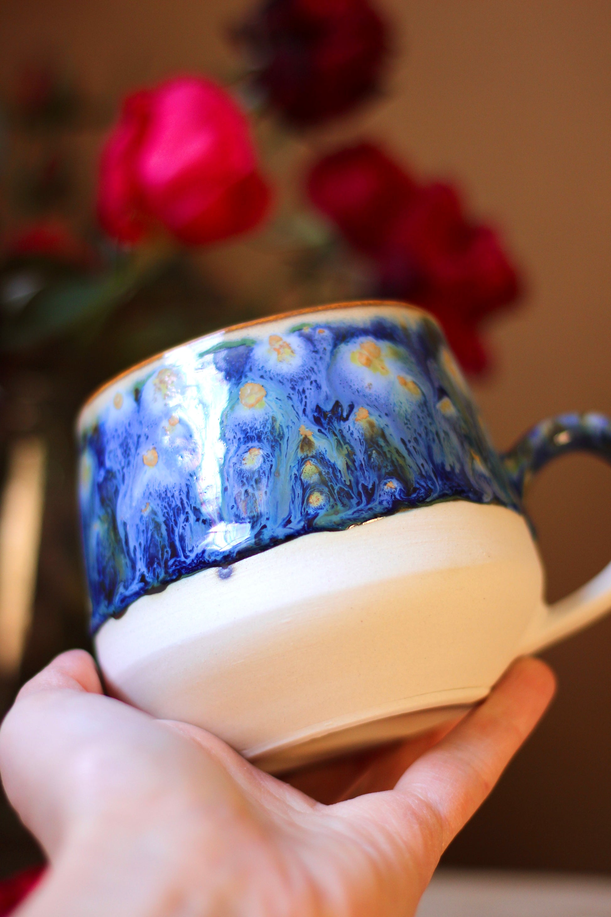 Šálka je z vonkajšej strany prijemná na dotyk. Vnútro šálky je glazúrované jednou z glazúr "Piesok, Bodkovaná vanilka, Ruža alebo Tyrkys". Viď foto vnútra šálky. Šálka je zo spodu neglazovaná.